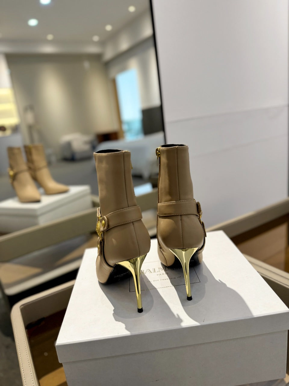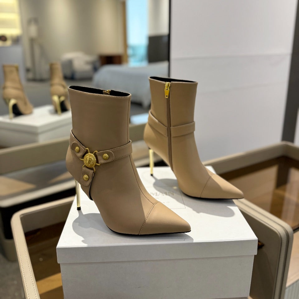BALMAIN 26S STILETTO HEEL BOOTS 95 MM IN DARK BEIGE CALFSKIN