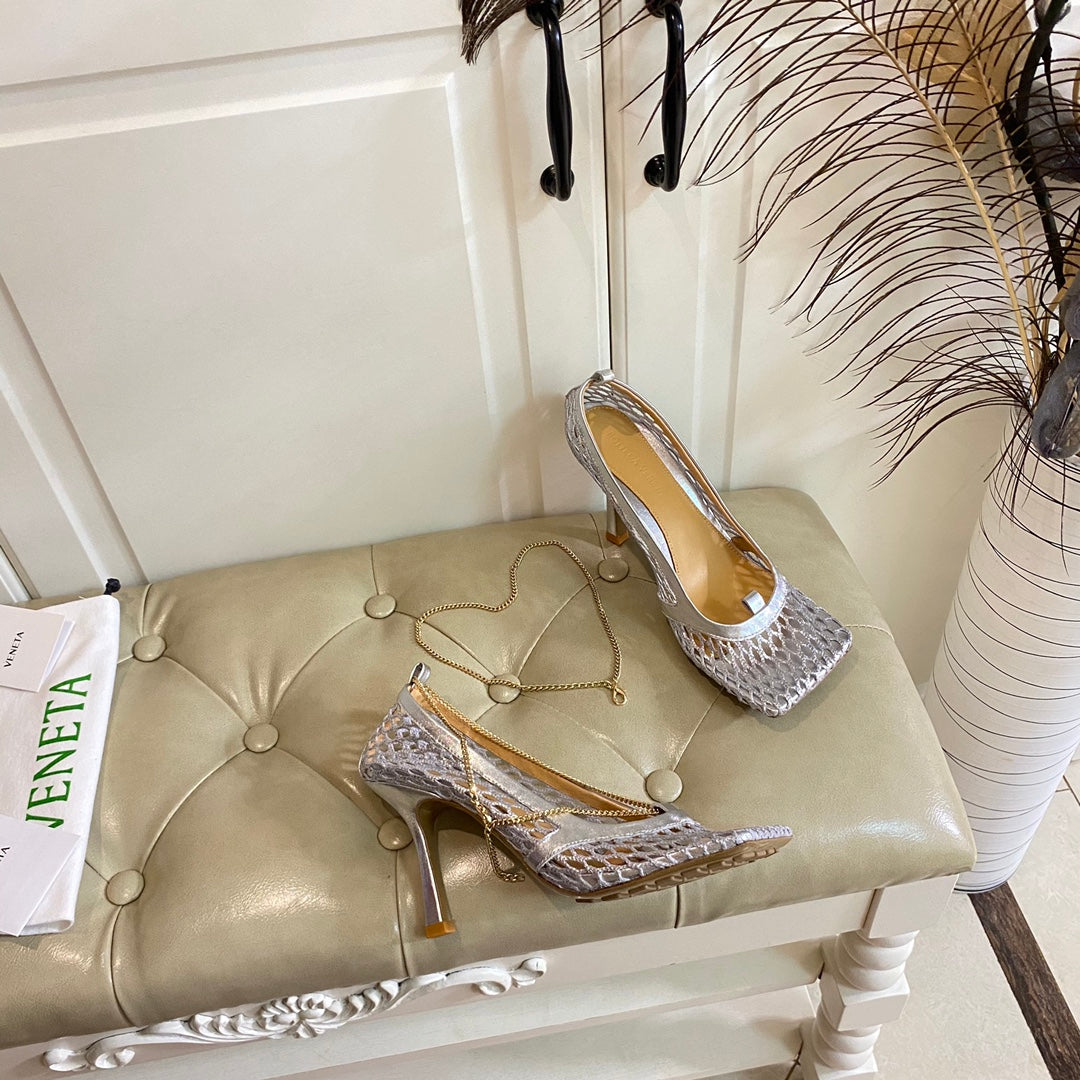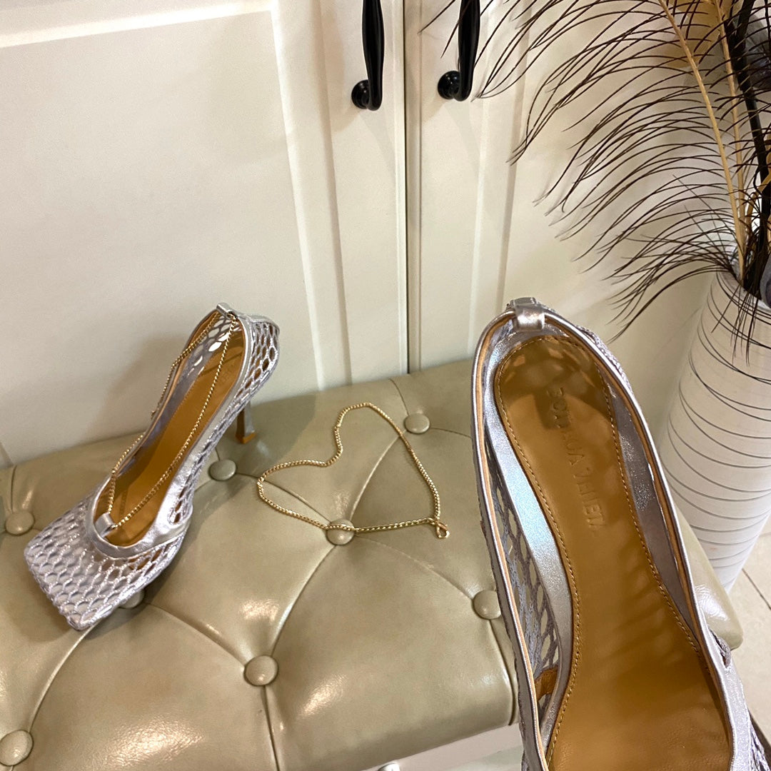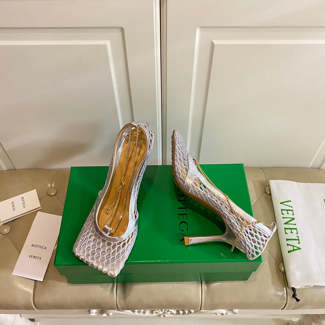 STRETCH LACE-UP SANDAL IN SILVER METALLIZED MESH AND LEATHER 9 CM