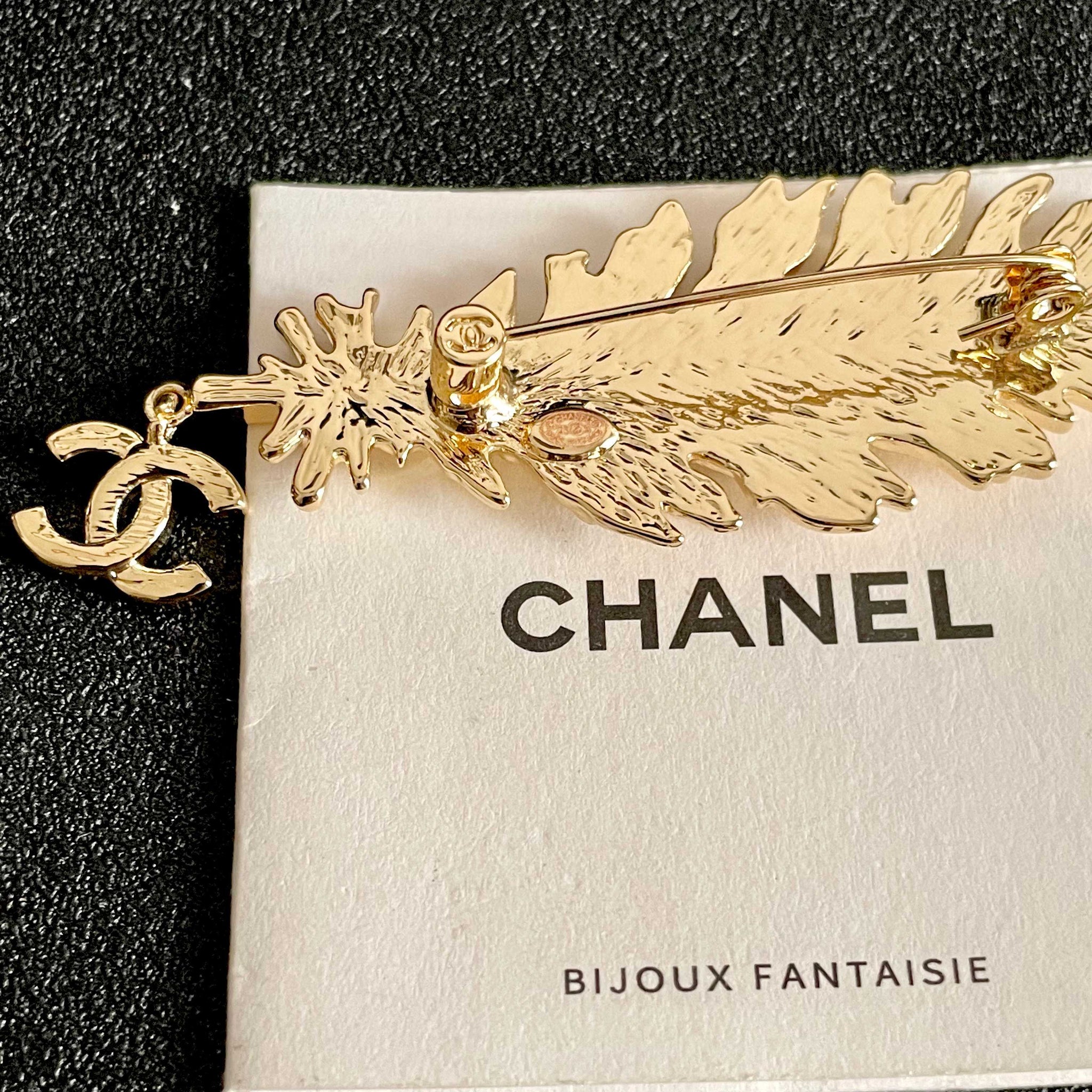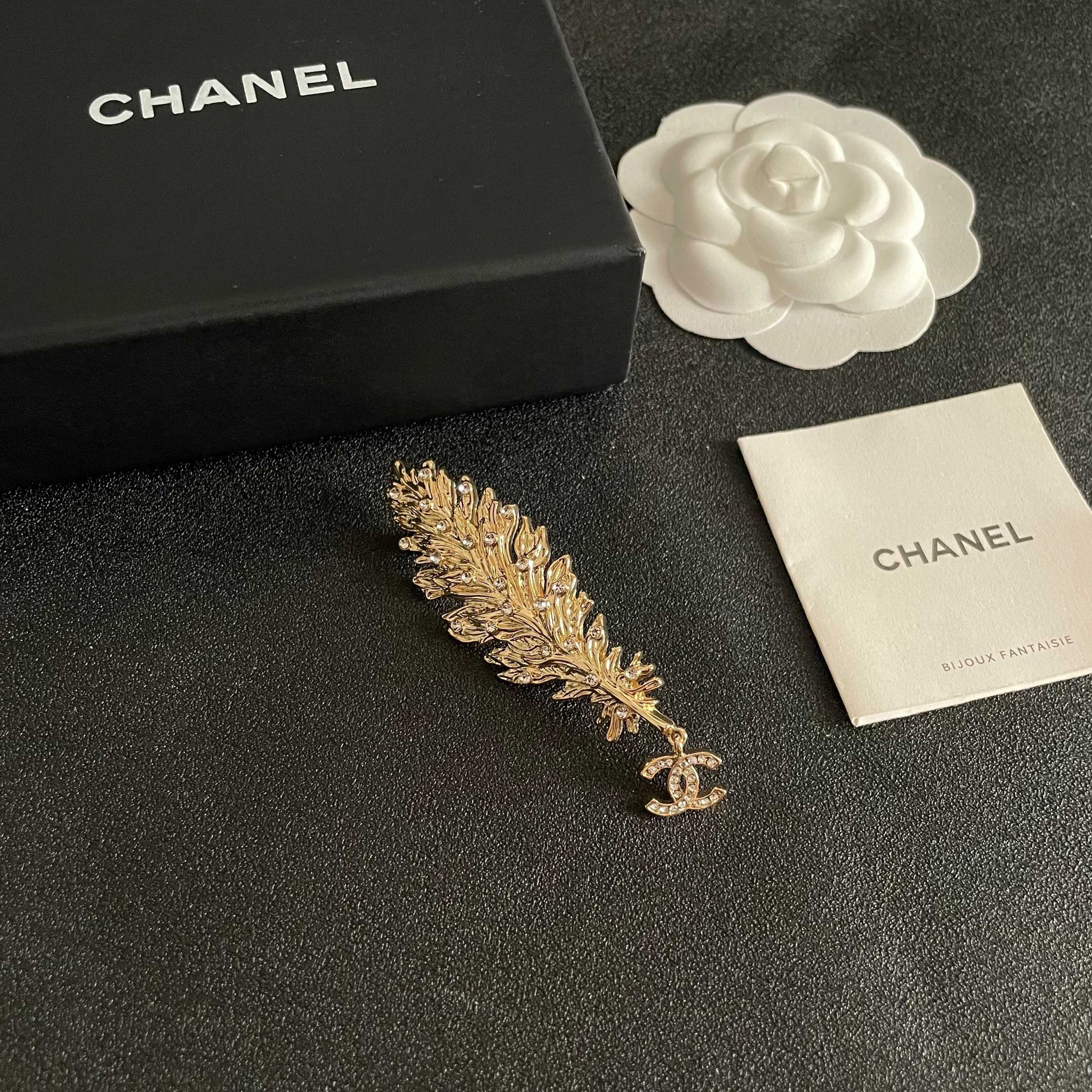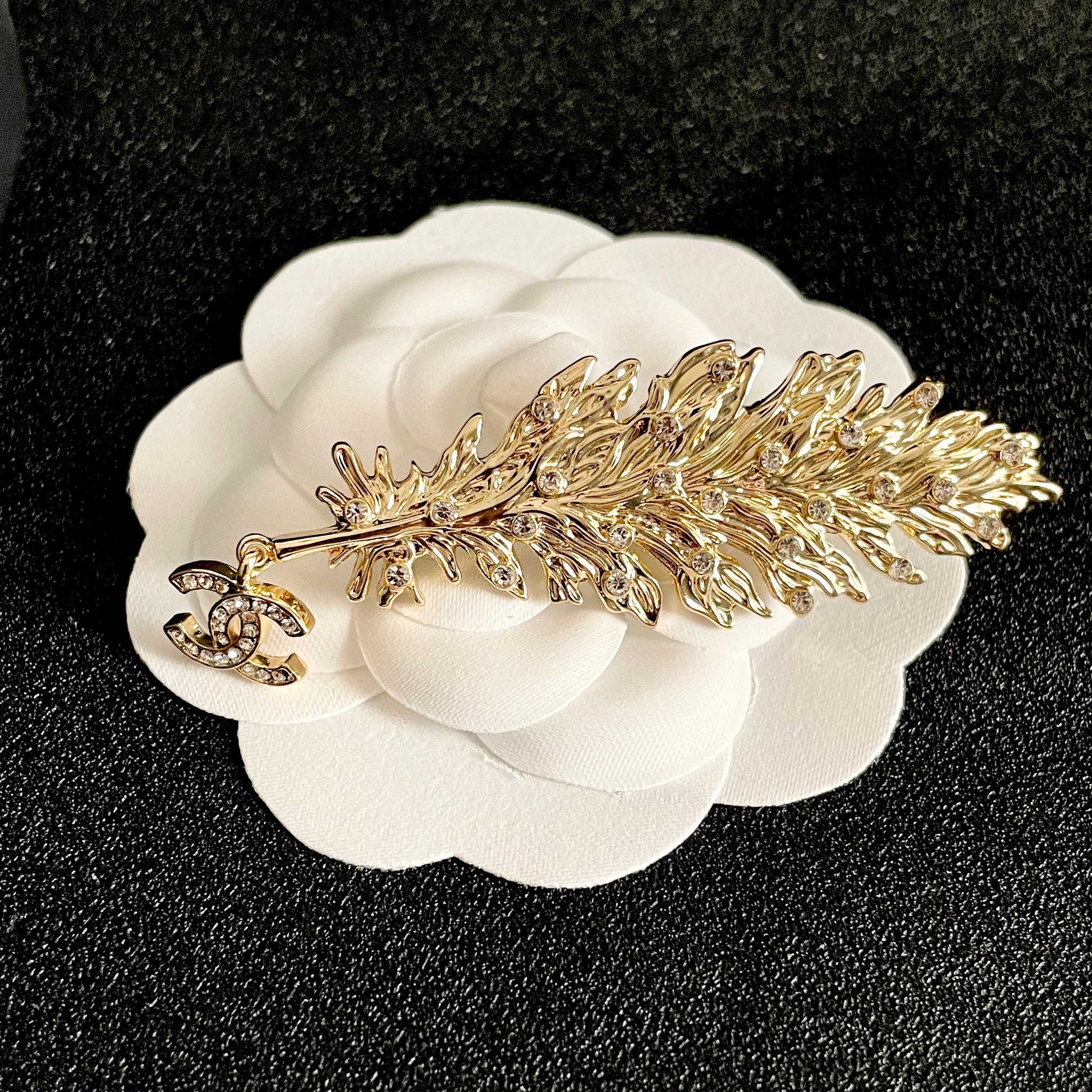 CHANEL 26S DOUBLE C LOGO CRYSTAL EMBELLISHED LEAF BROOCH IN GOLD METAL 630082