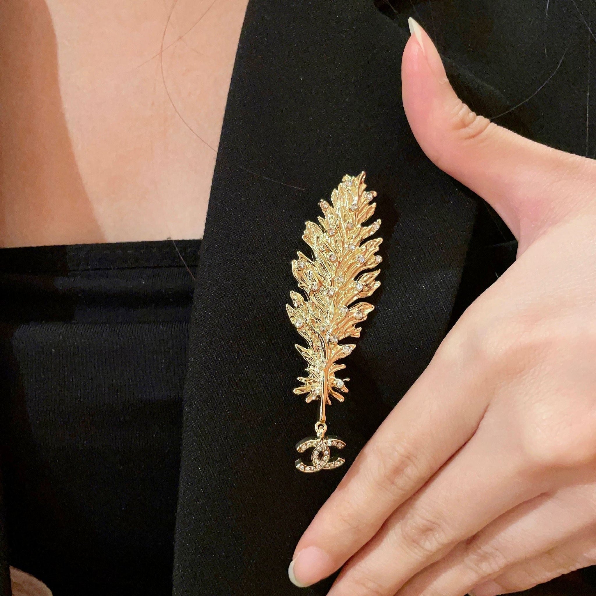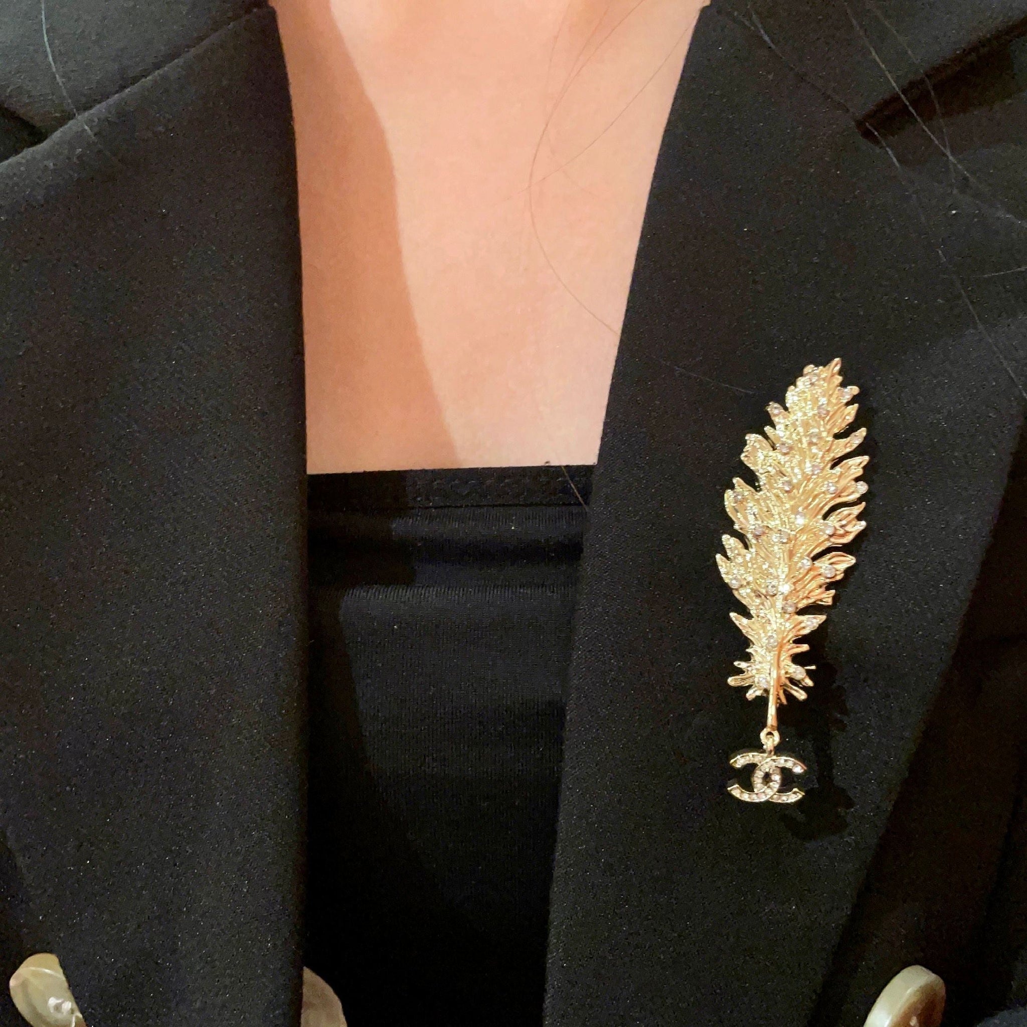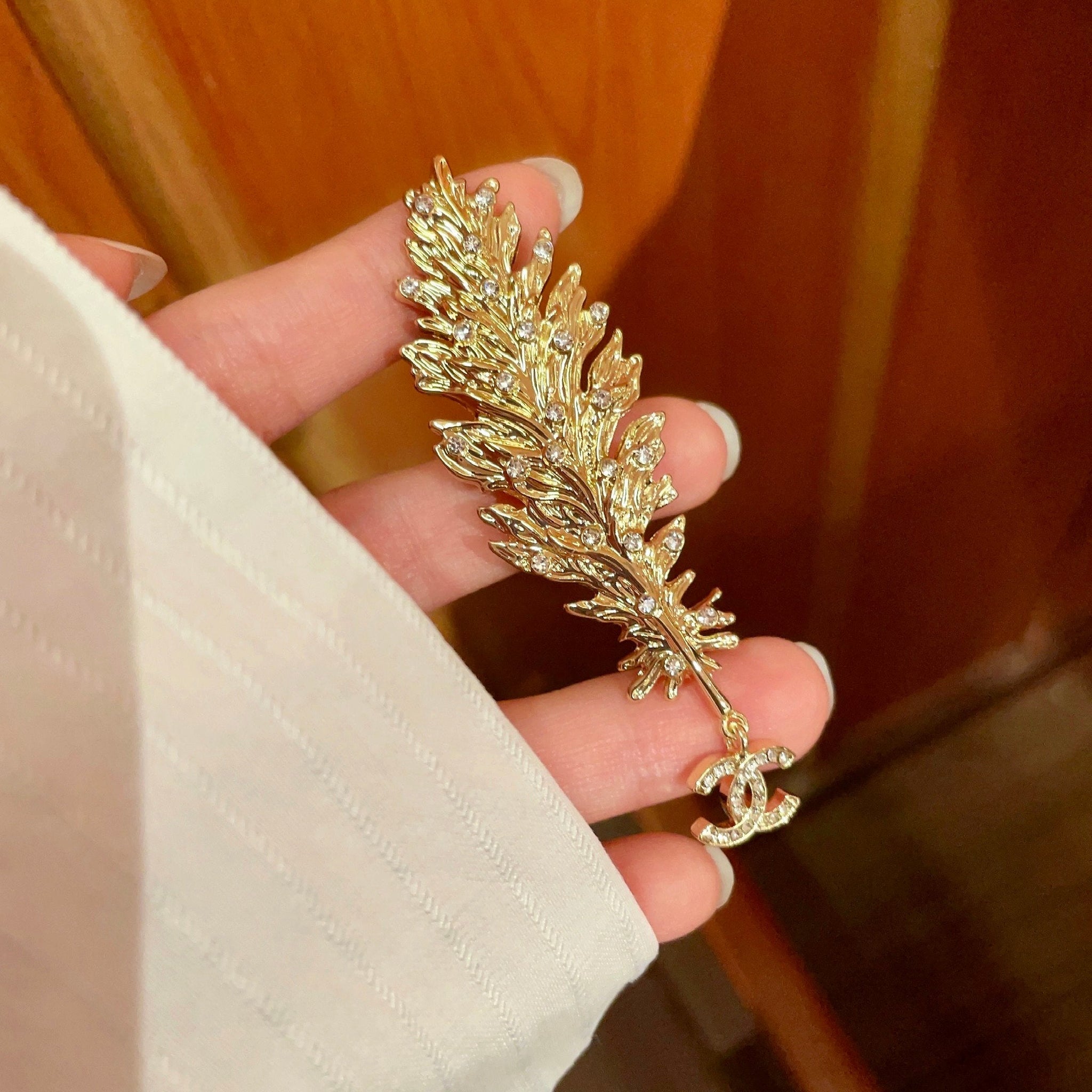 CHANEL 26S DOUBLE C LOGO CRYSTAL EMBELLISHED LEAF BROOCH IN GOLD METAL 630082