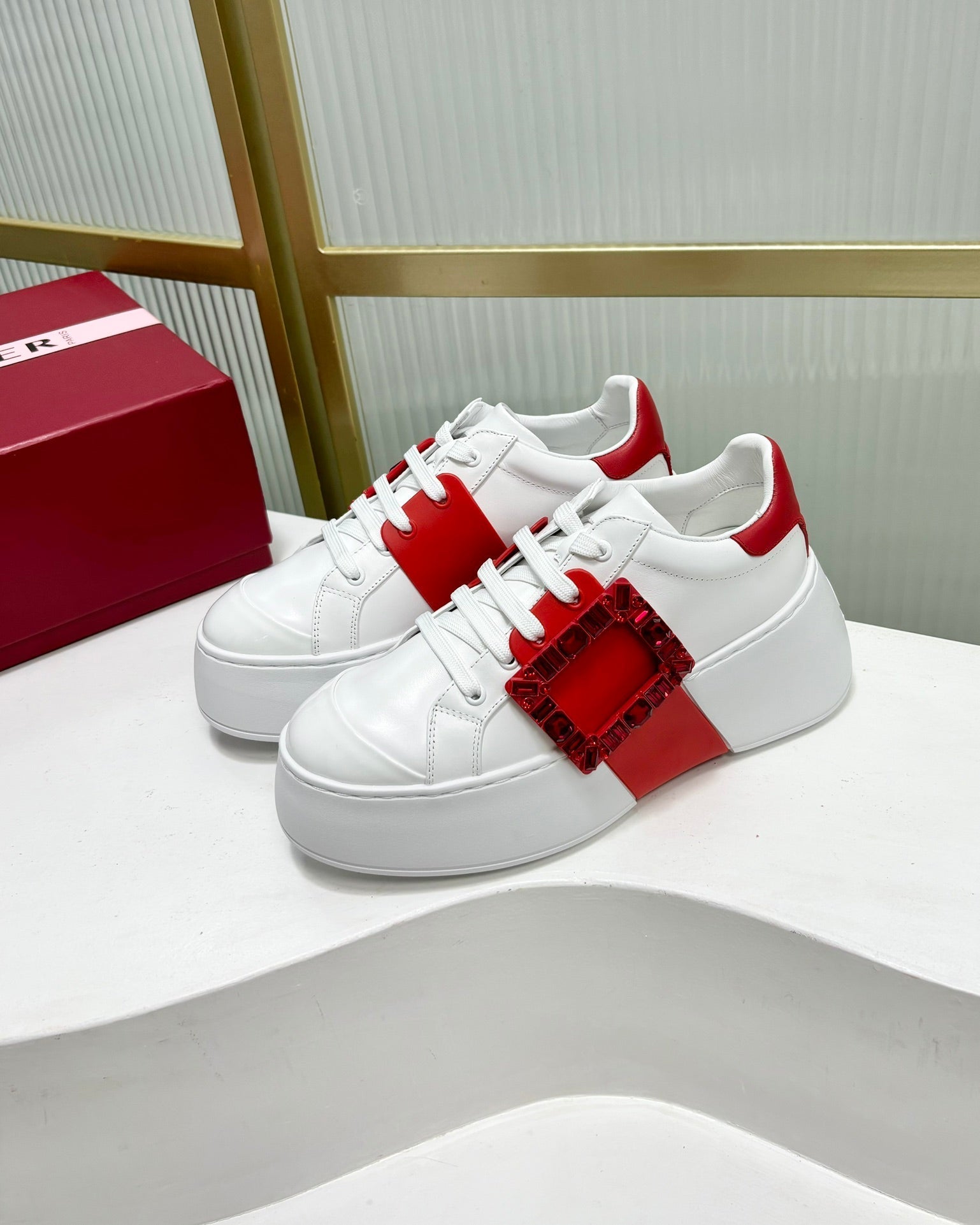 VIV' SKATE SNEAKERS IN WHITE CALFSKIN RED GLITTER STRAP AND CRYSTAL BUCKLE