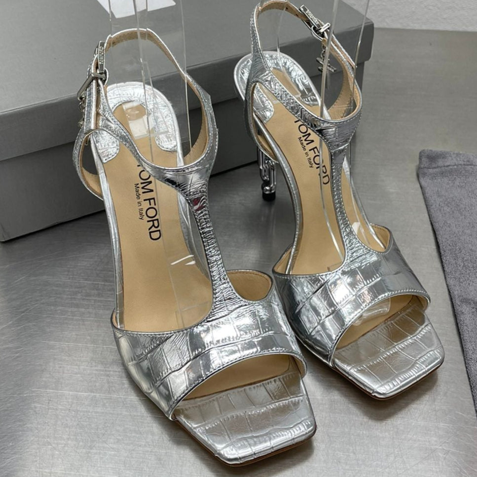 HIGH-HEELED T-STRAP SANDAL IN SILVER CALFSKIN