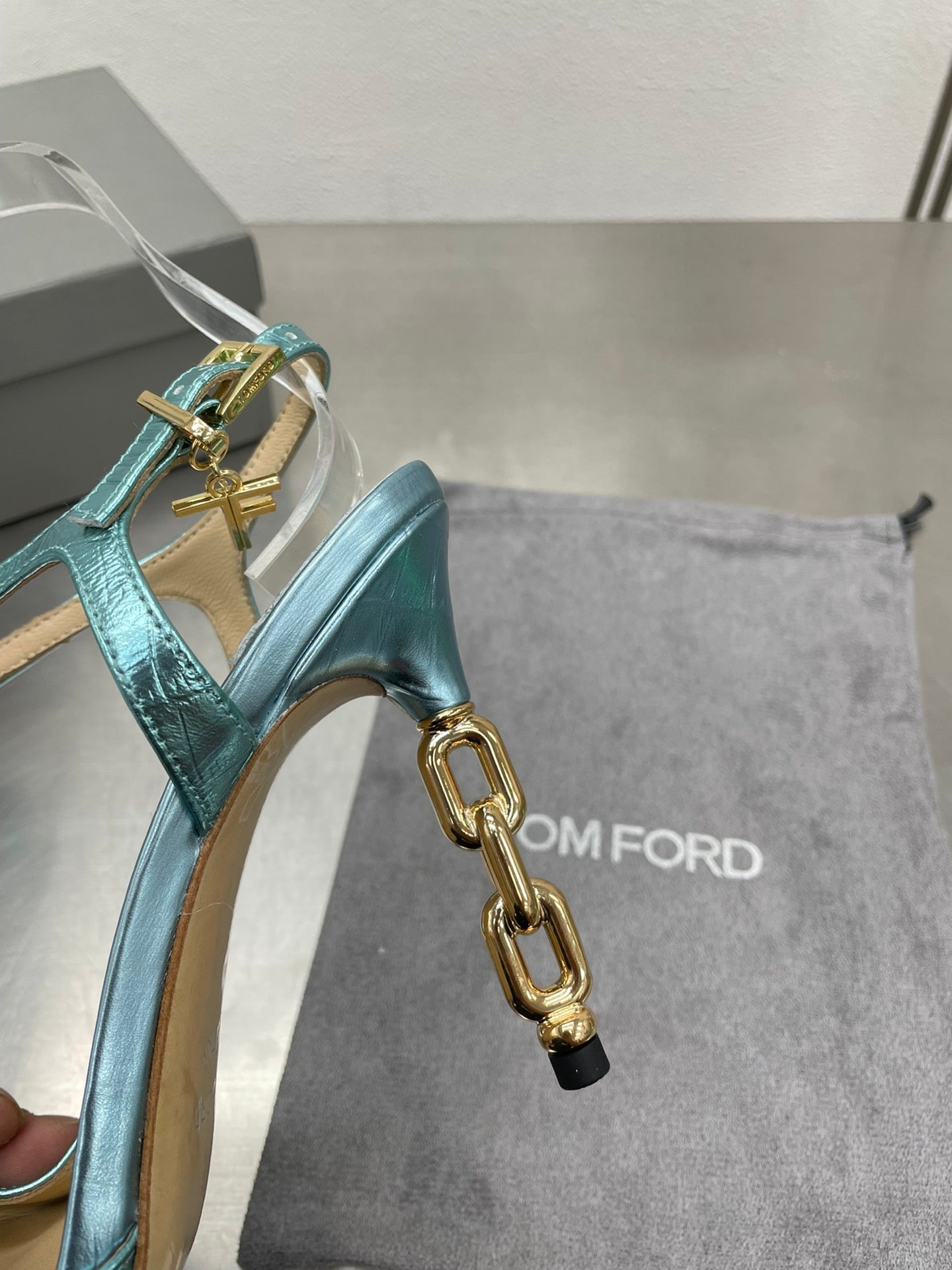 HIGH-HEELED T-STRAP SANDAL IN SKY BLUE CALFSKIN