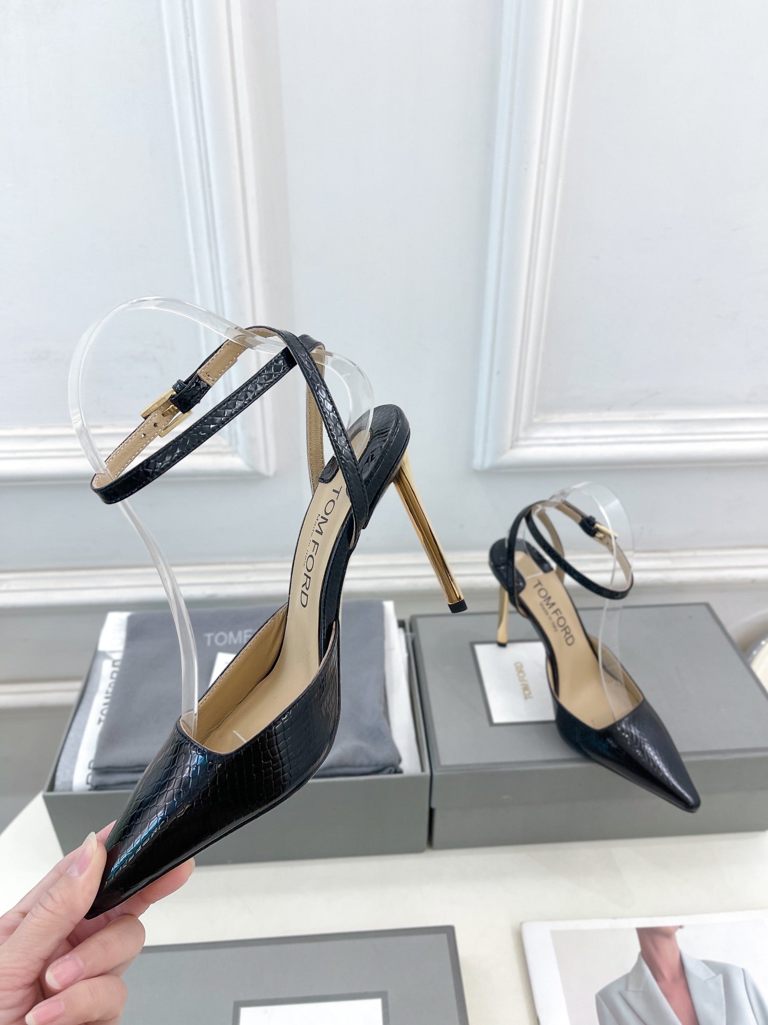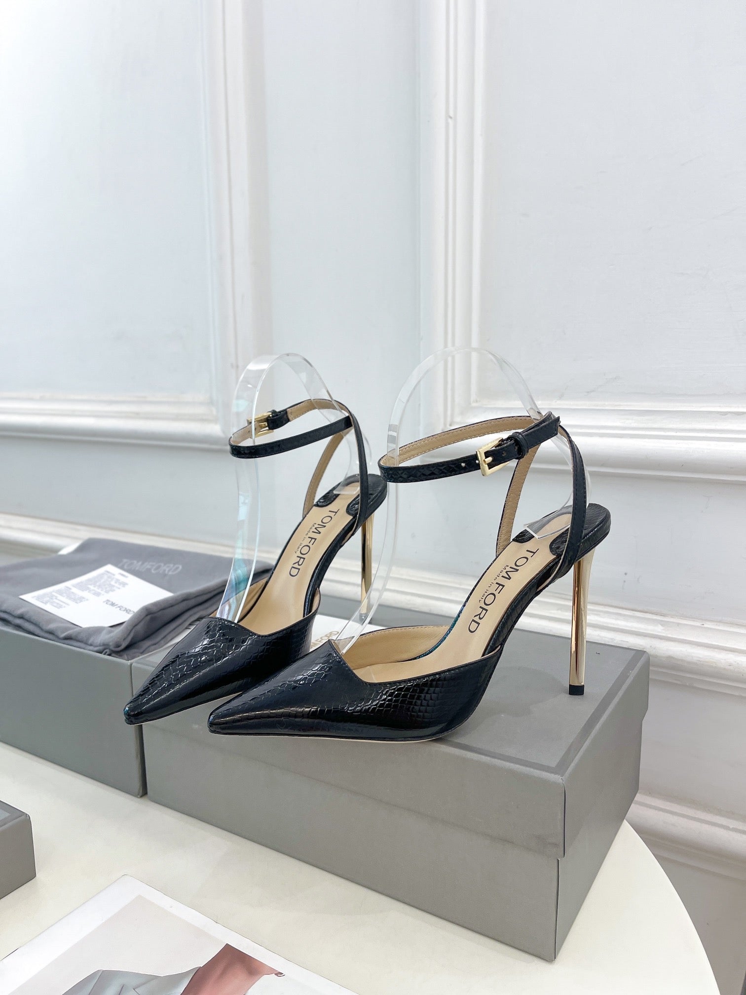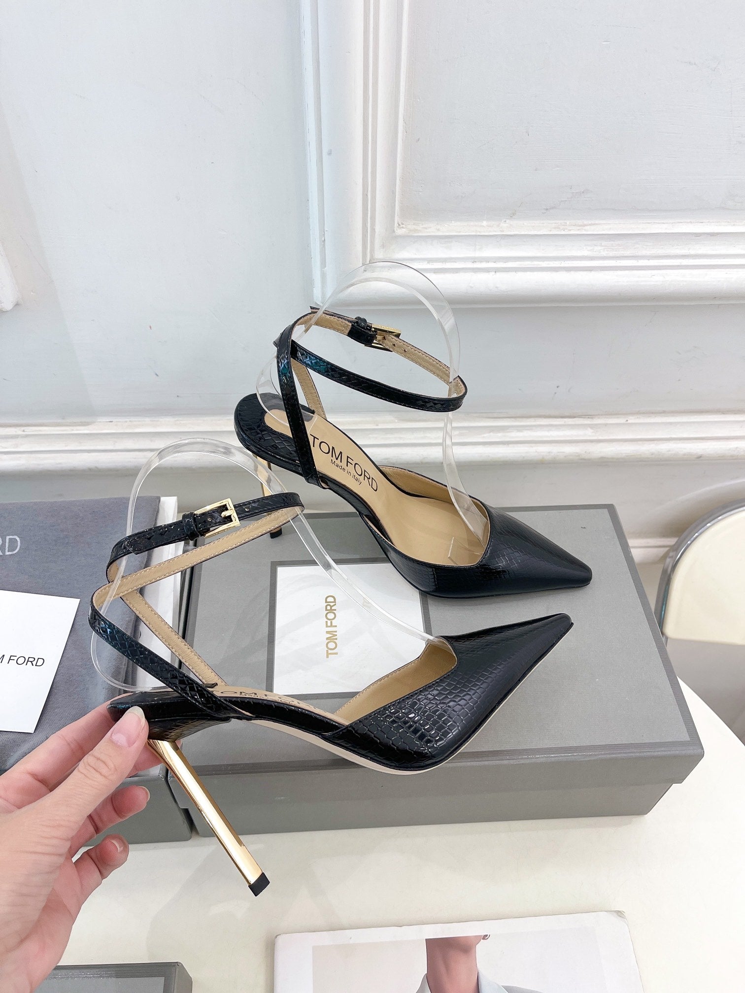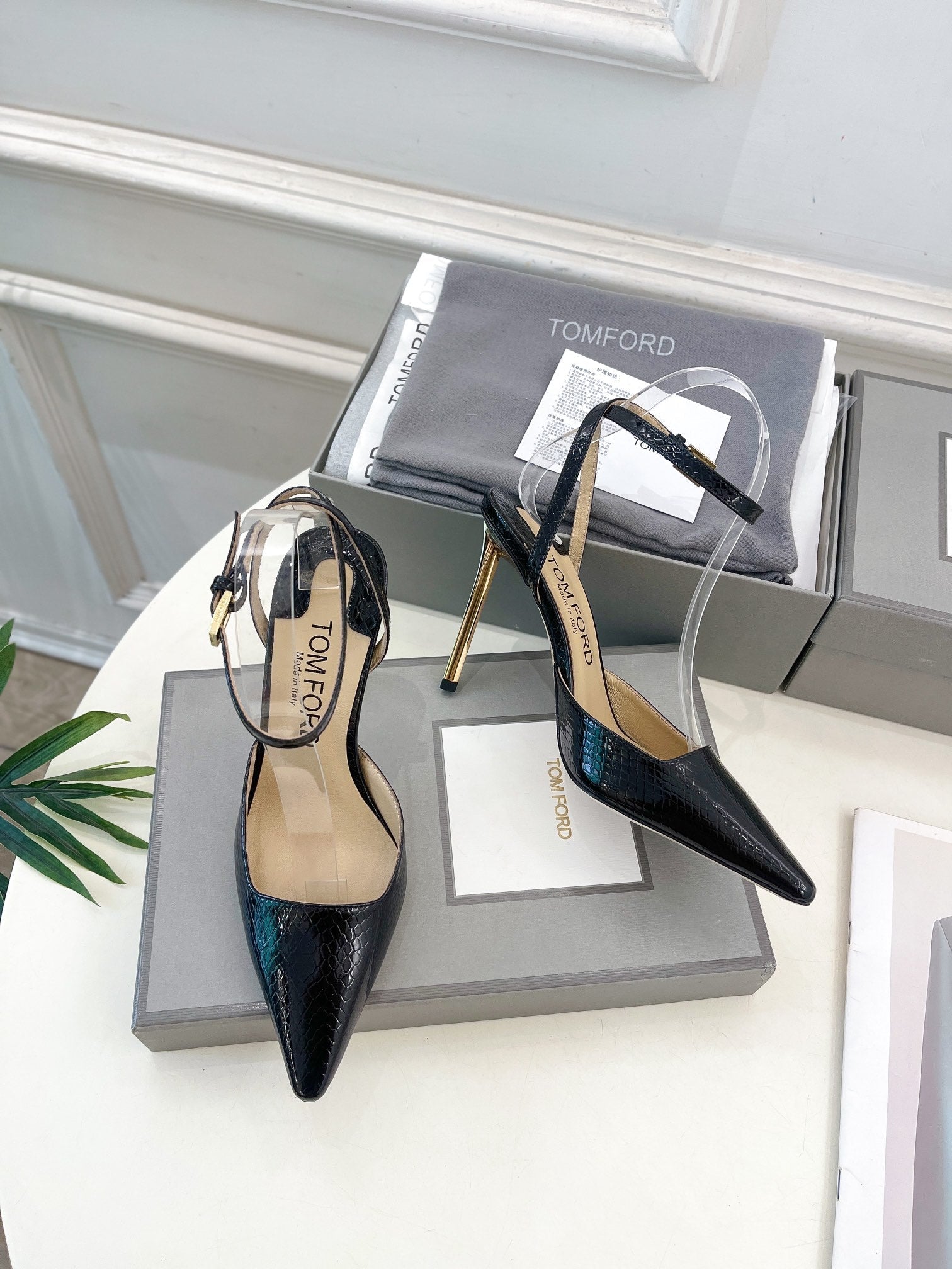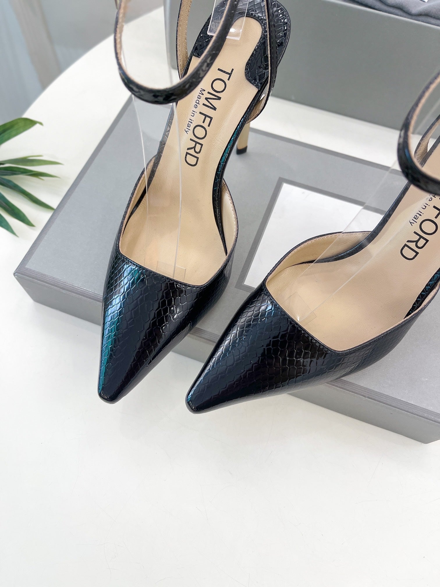 HIGH SLINGBACKS 10 CM IN BLACK SNAKE-PATTERN CALFSKIN
