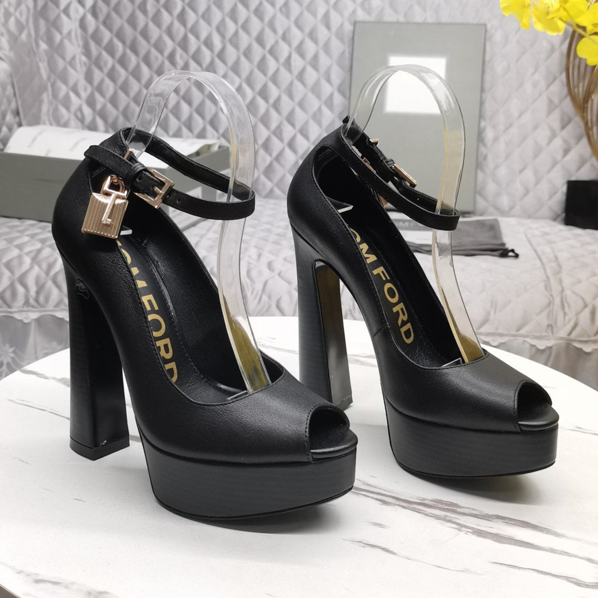 PADLOCK PLATFORM PEEP TOE PUMP 14 CM IN BLACK CALFSKIN