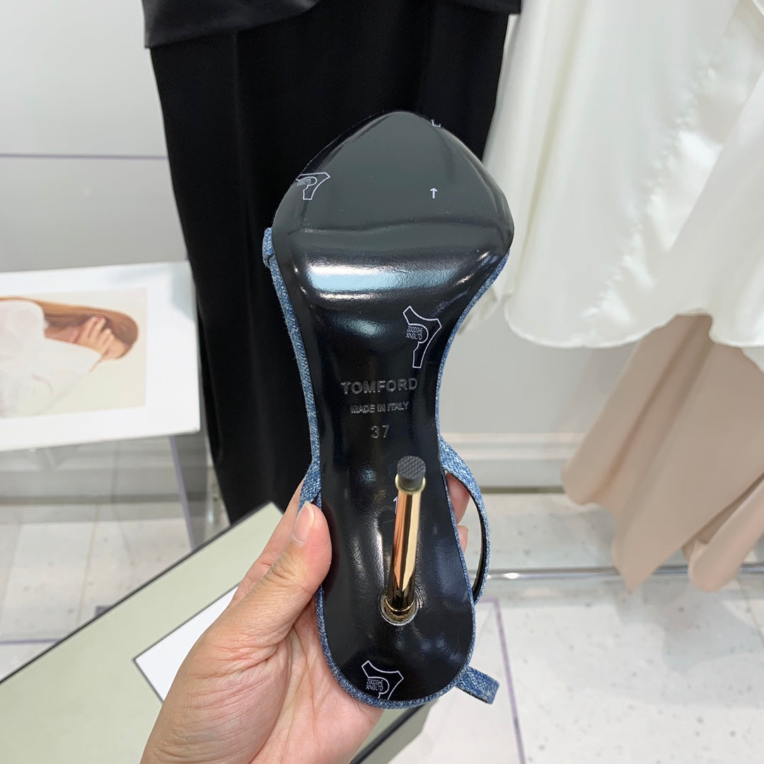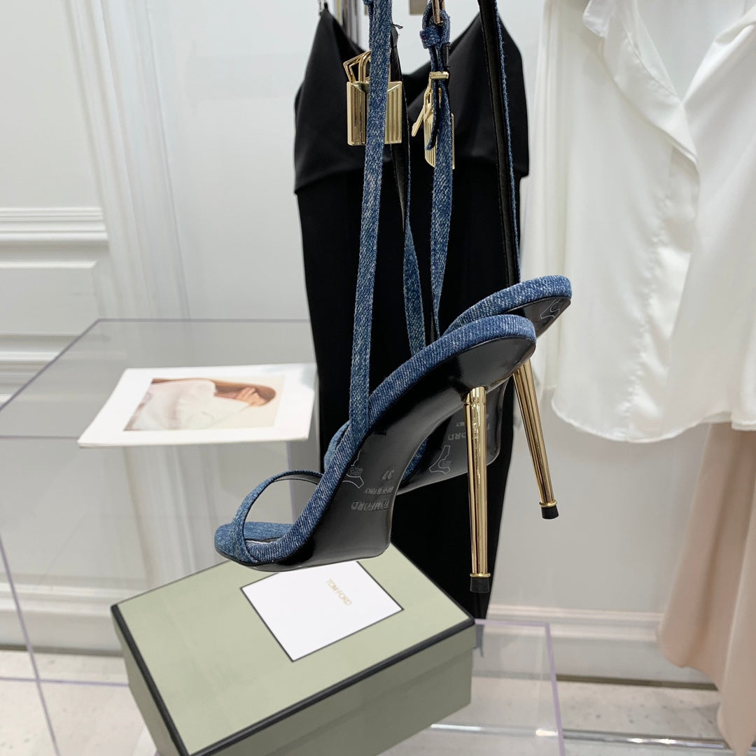 TOM FORD 26S GOLD BUCKLE HEELS 105 MM IN BLUE DENIM