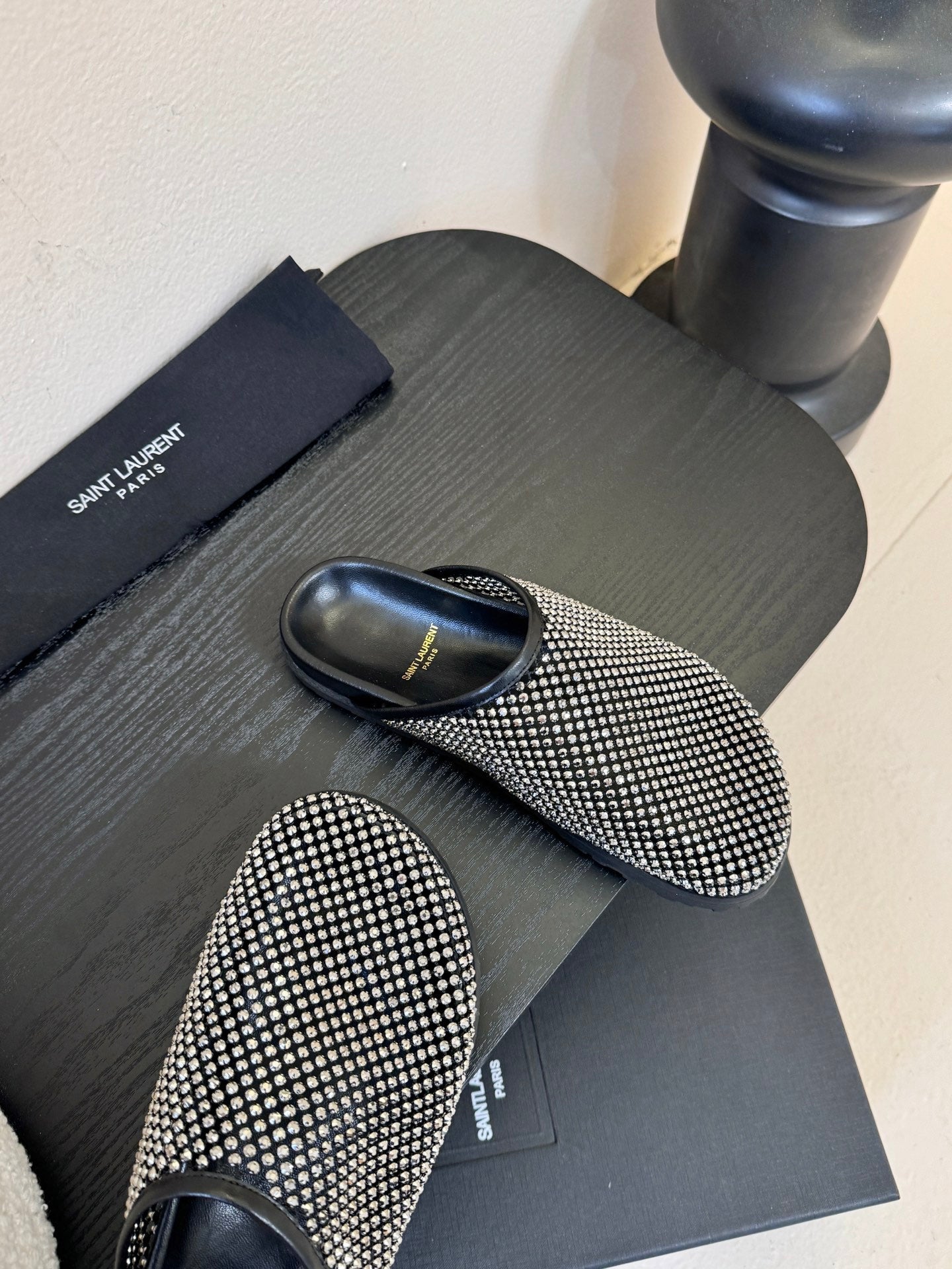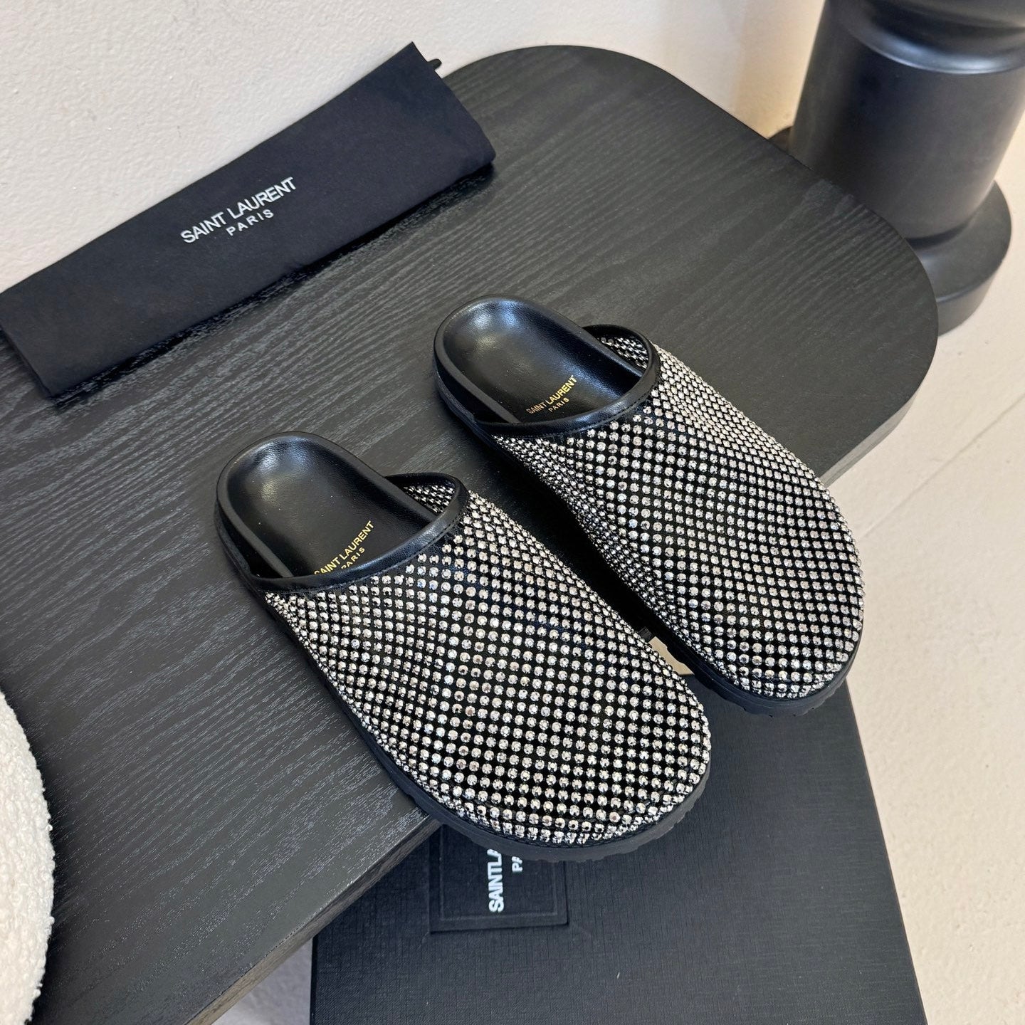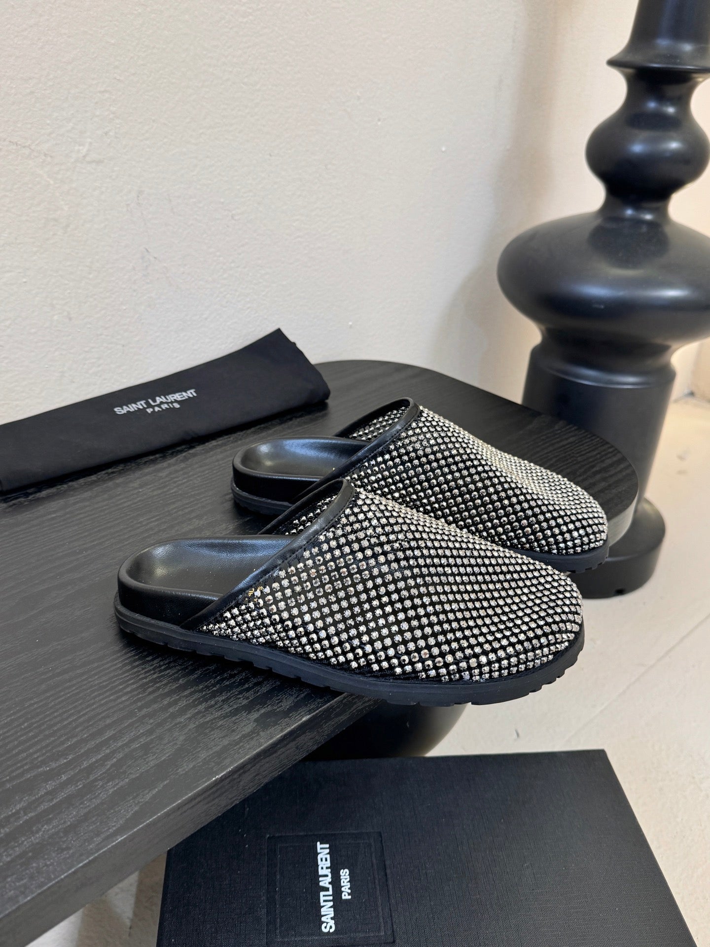 YSL 26S MESH MULES IN BLACK CALFSKIN AND WITH RHINESTONES