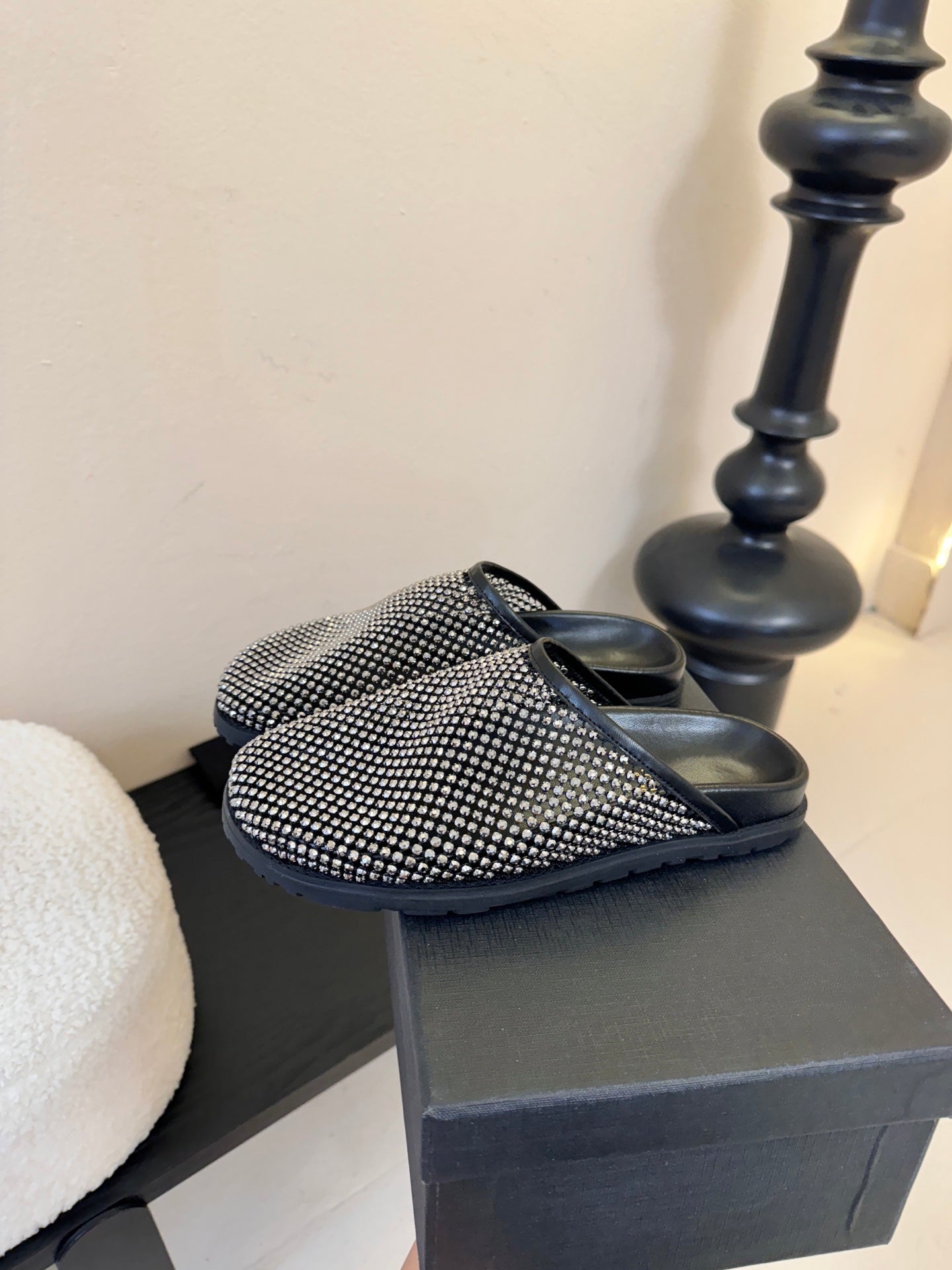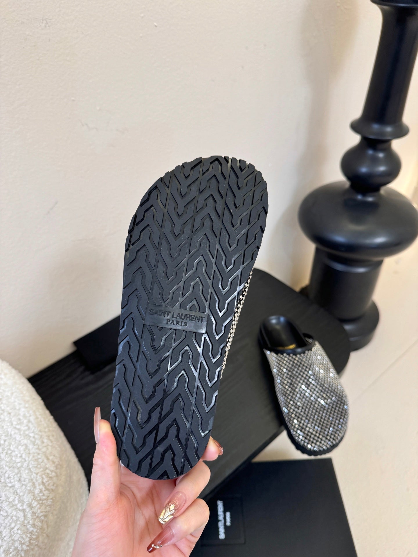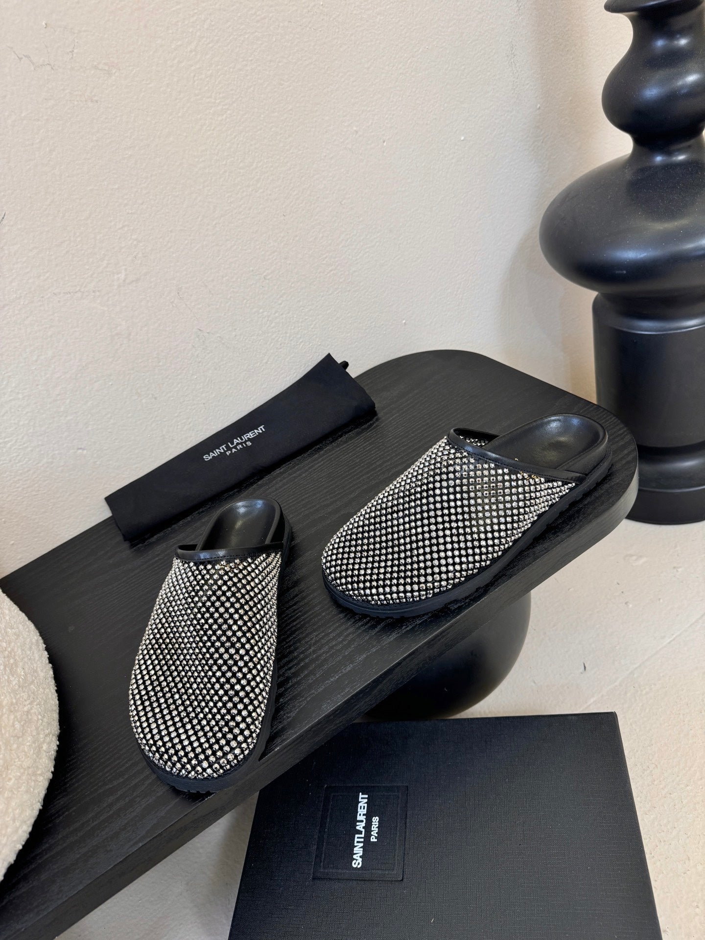 YSL 26S MESH MULES IN BLACK CALFSKIN AND WITH RHINESTONES