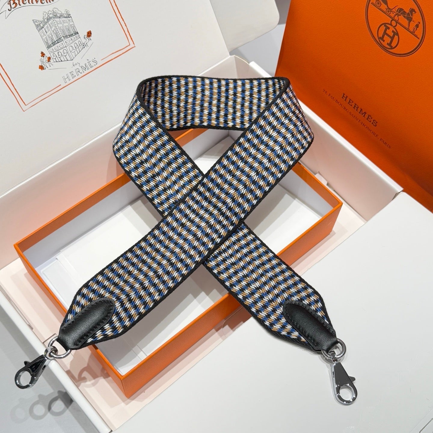 25S HERMES BAG STRAP BLUE PATTERN BORDERED BLACK 85 IN CANVAS SILVER HARDWARE