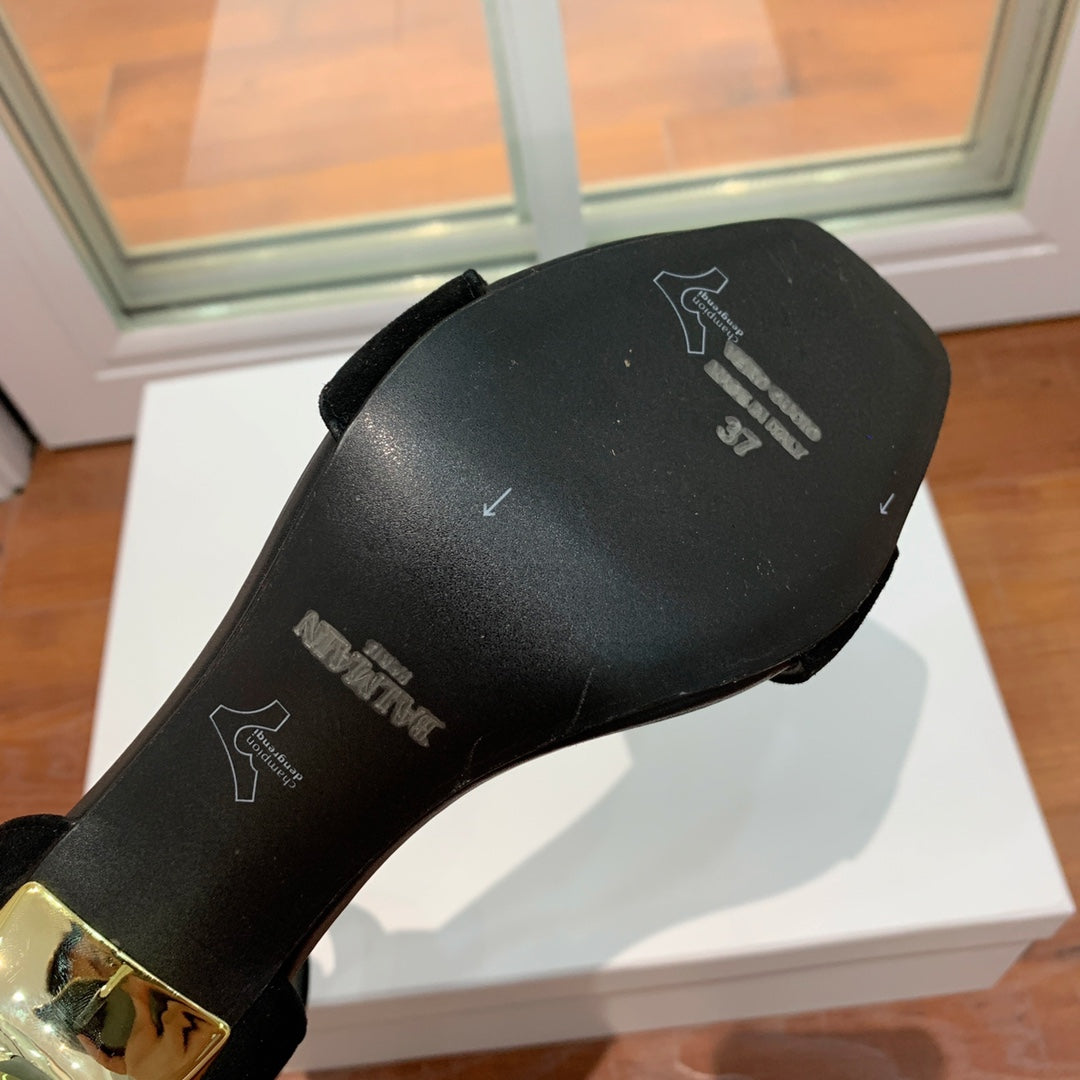 BALMAIN 25S THIN STRAP HIGH HEELS 105MM IN BLACK SUEDE GOLD HARDWARE