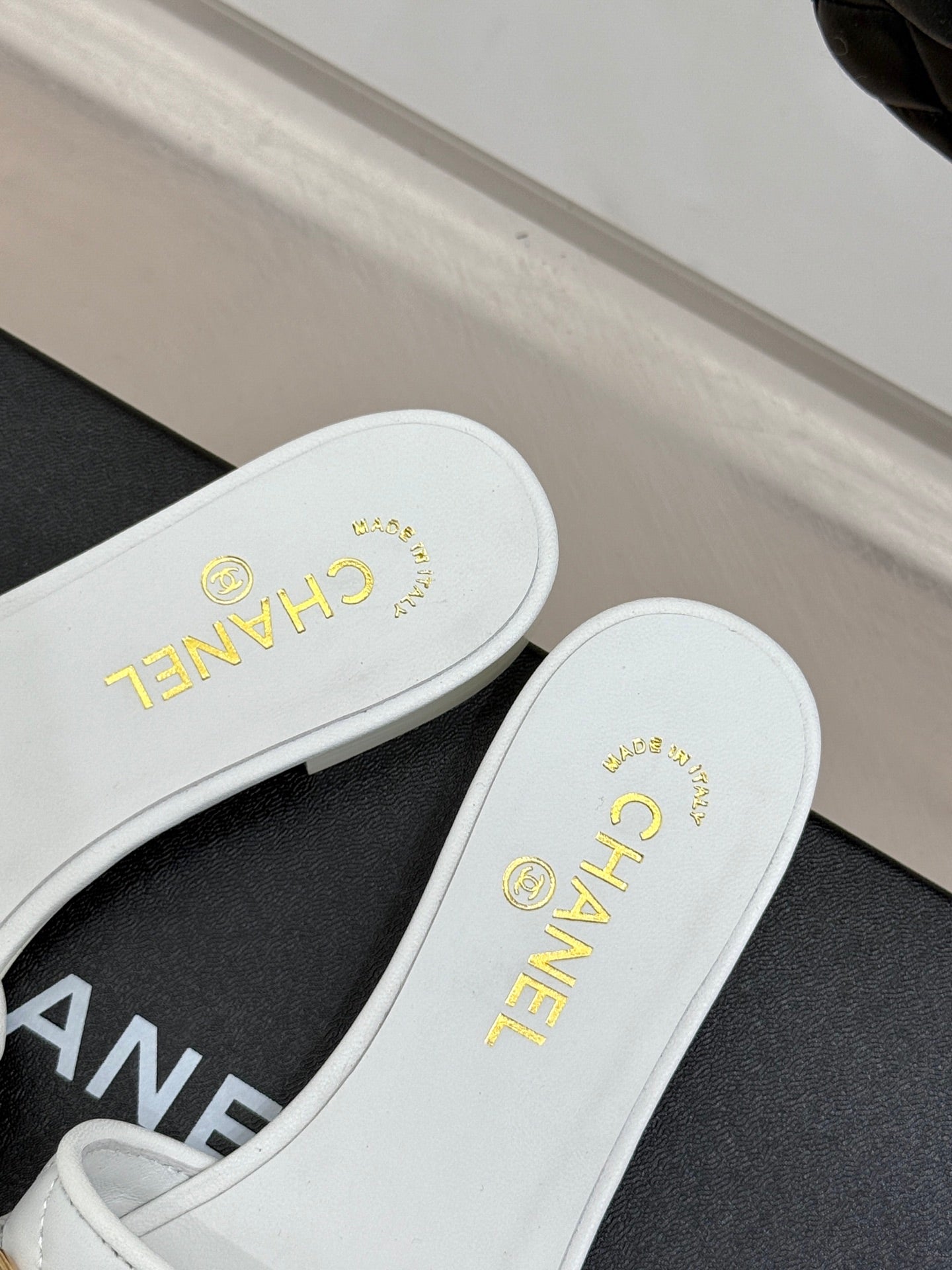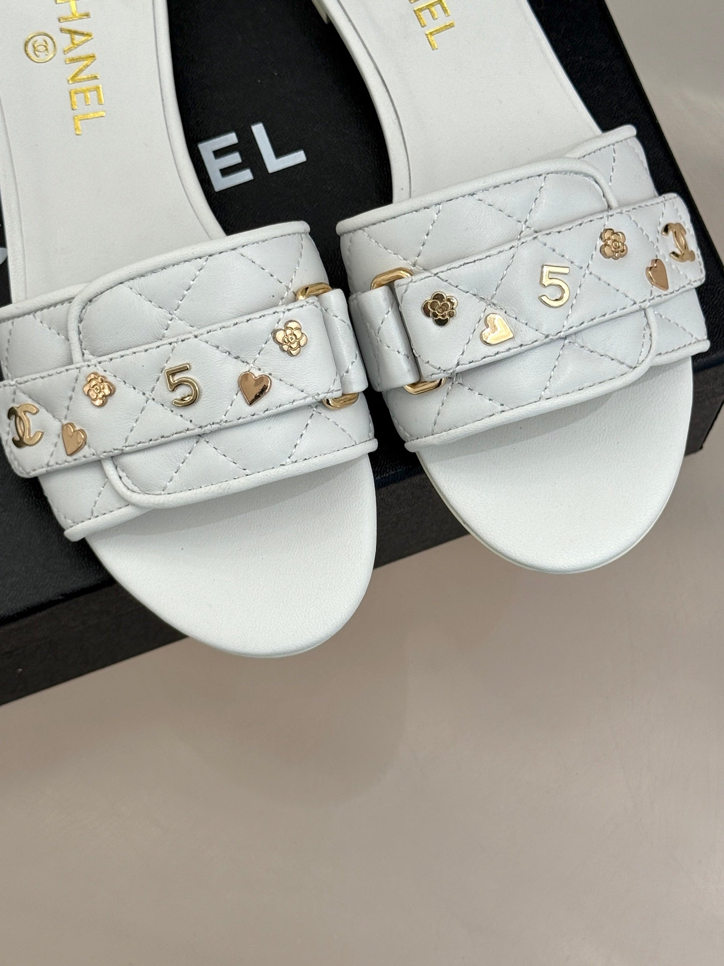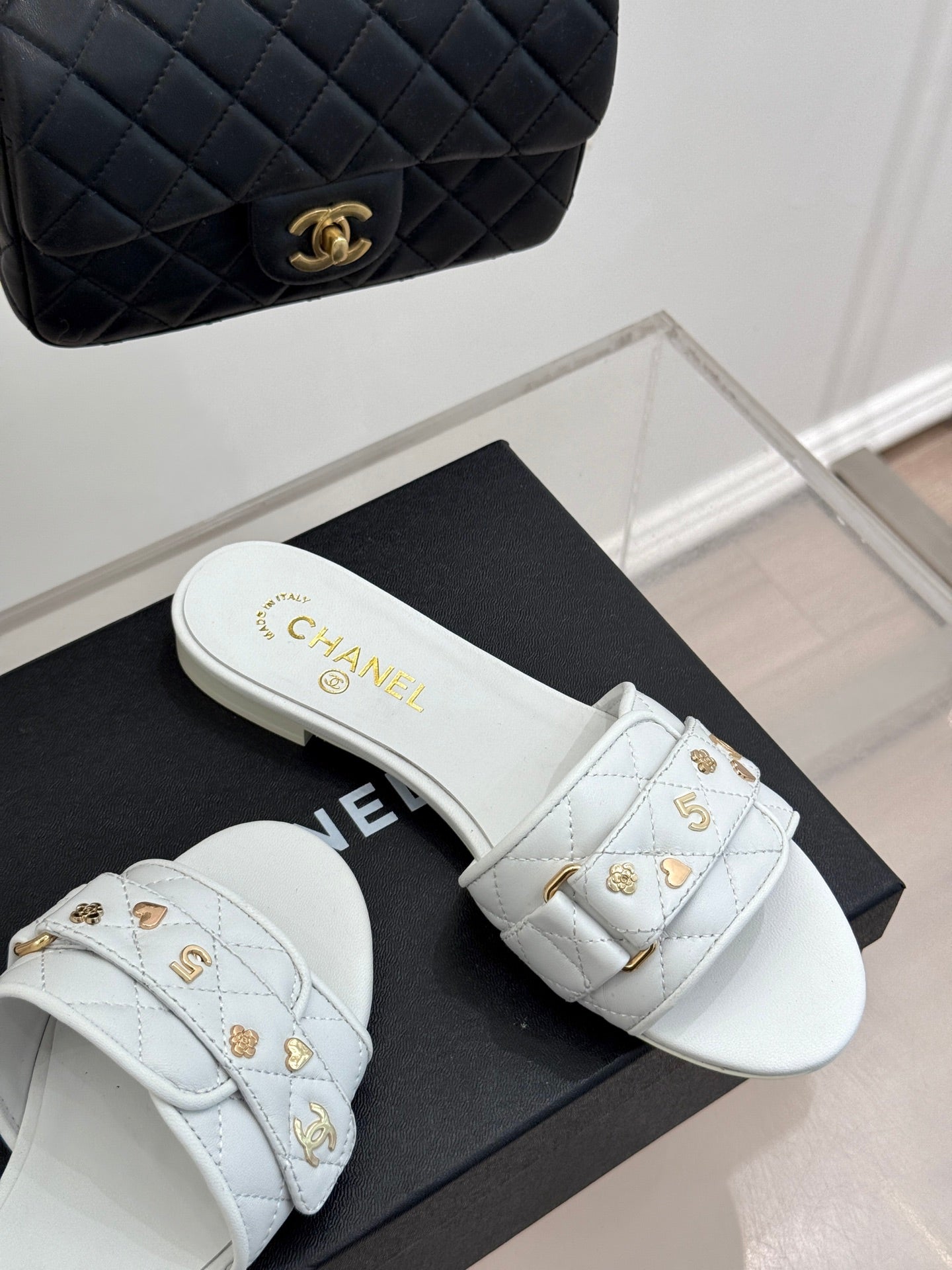 CC SLIDE SANDALS IN WHITE CALFSKIN GOLD CHARM