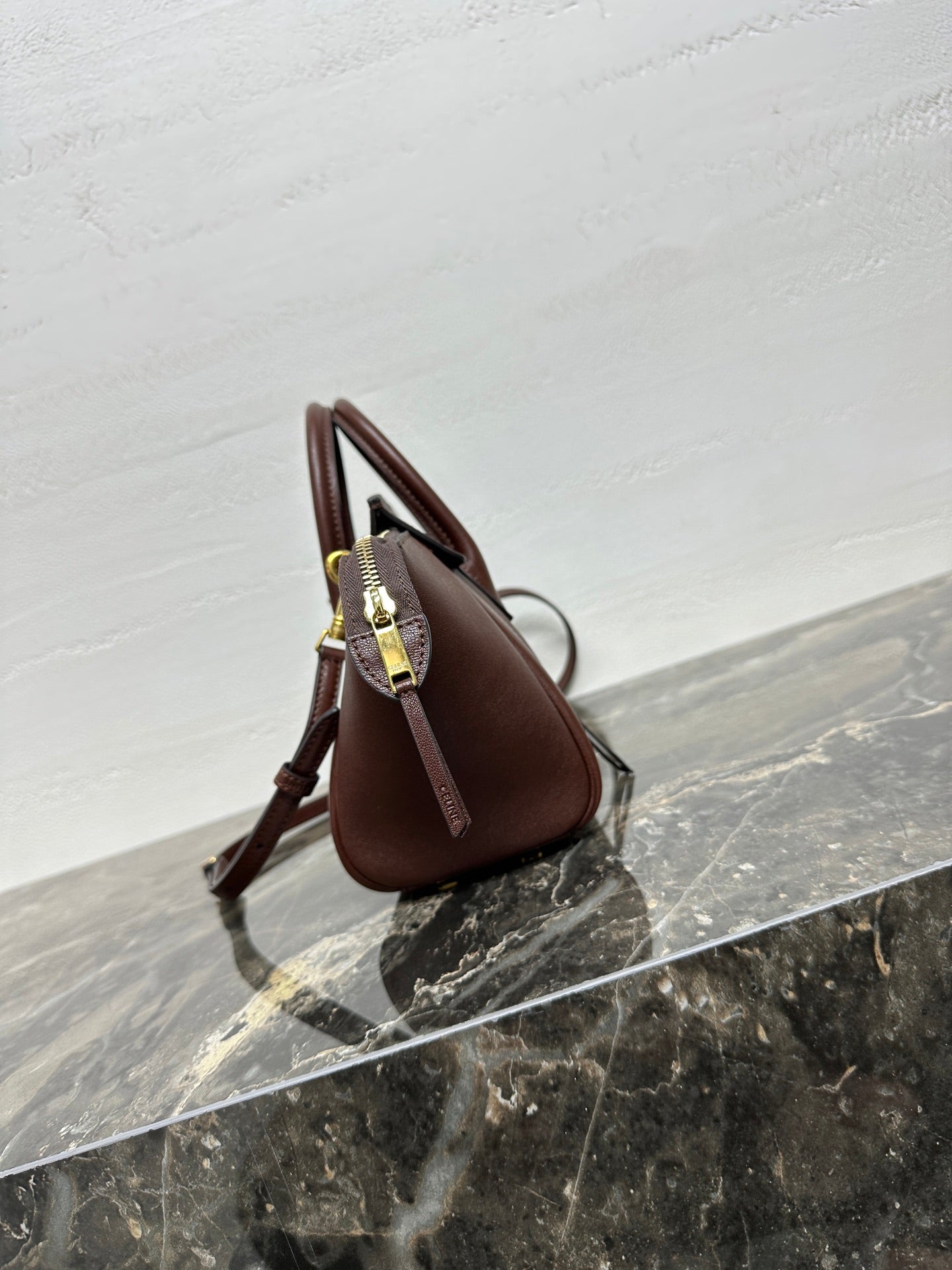 CELINE 25S NEW LUGGAGE 38MM IN CHOCOLATE BROWN  SHINY LAMBSKIN GOLD HARDWARE
