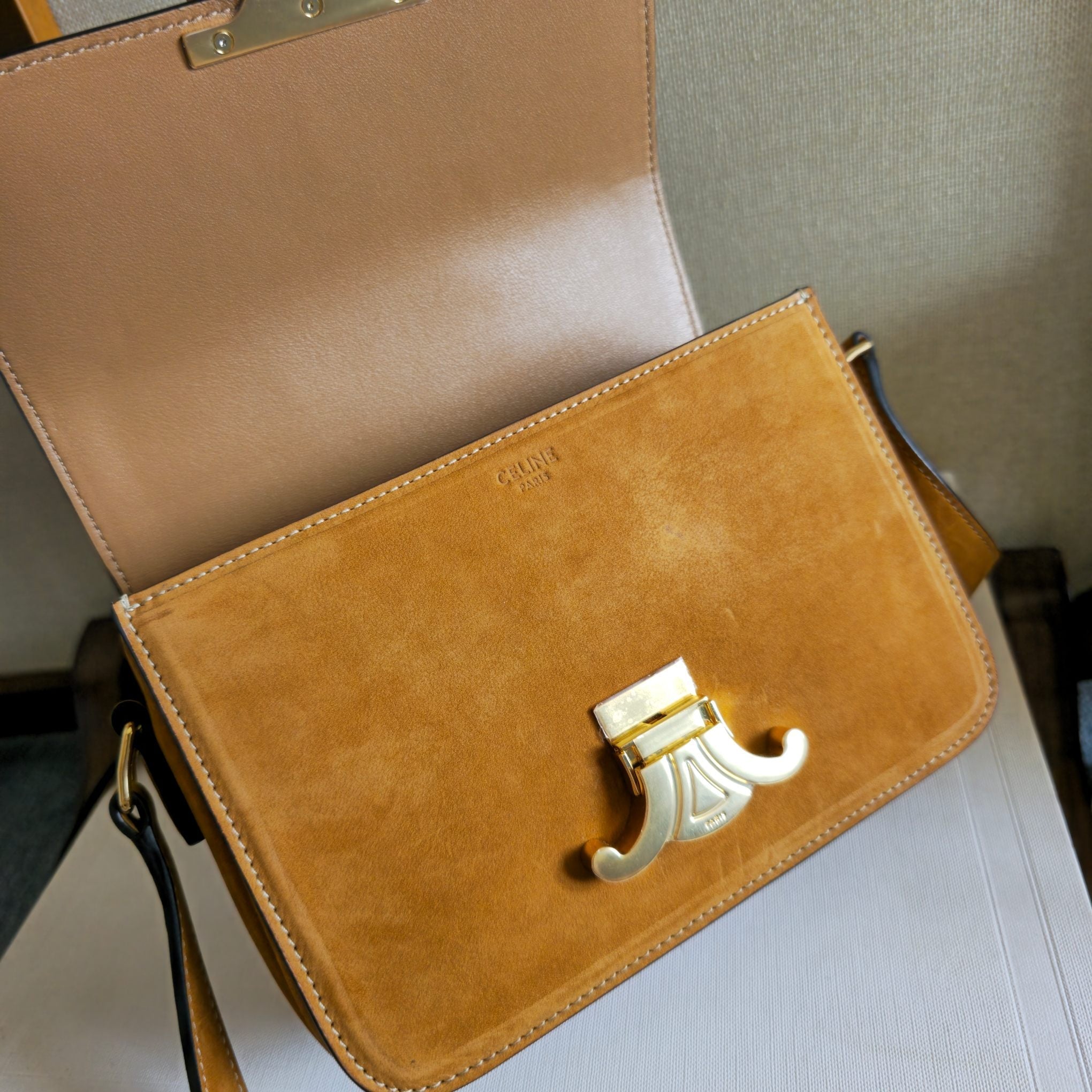 CELINE 25S TEEN TRIOMPHE BAG 18MM IN CARAMEL BROWN SUEDE GOLD HARDWARE