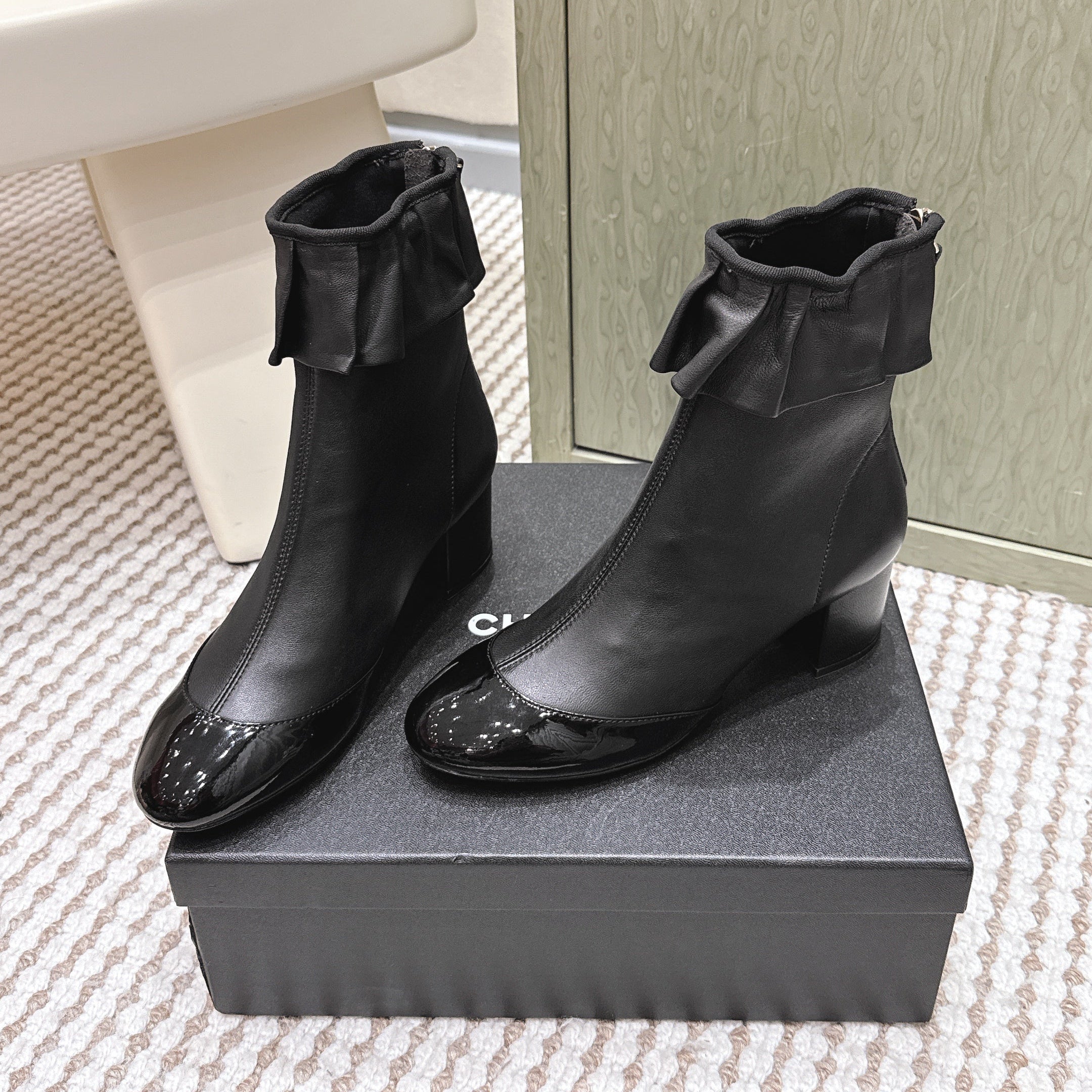 CHANEL 25S ANKLE BOOTS IN BLACK CALFSKIN GLOSSY TOE RUCHED