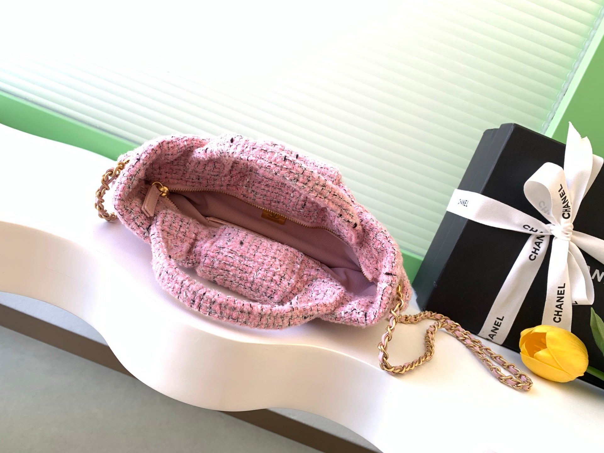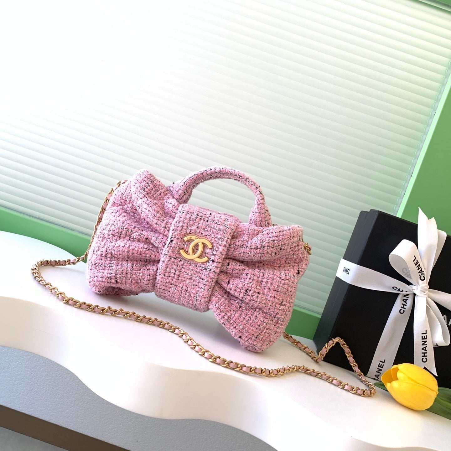 CHANEL 25S BOW BAG 26 IN PINK TWEED WITH GOLD HARDWARE
