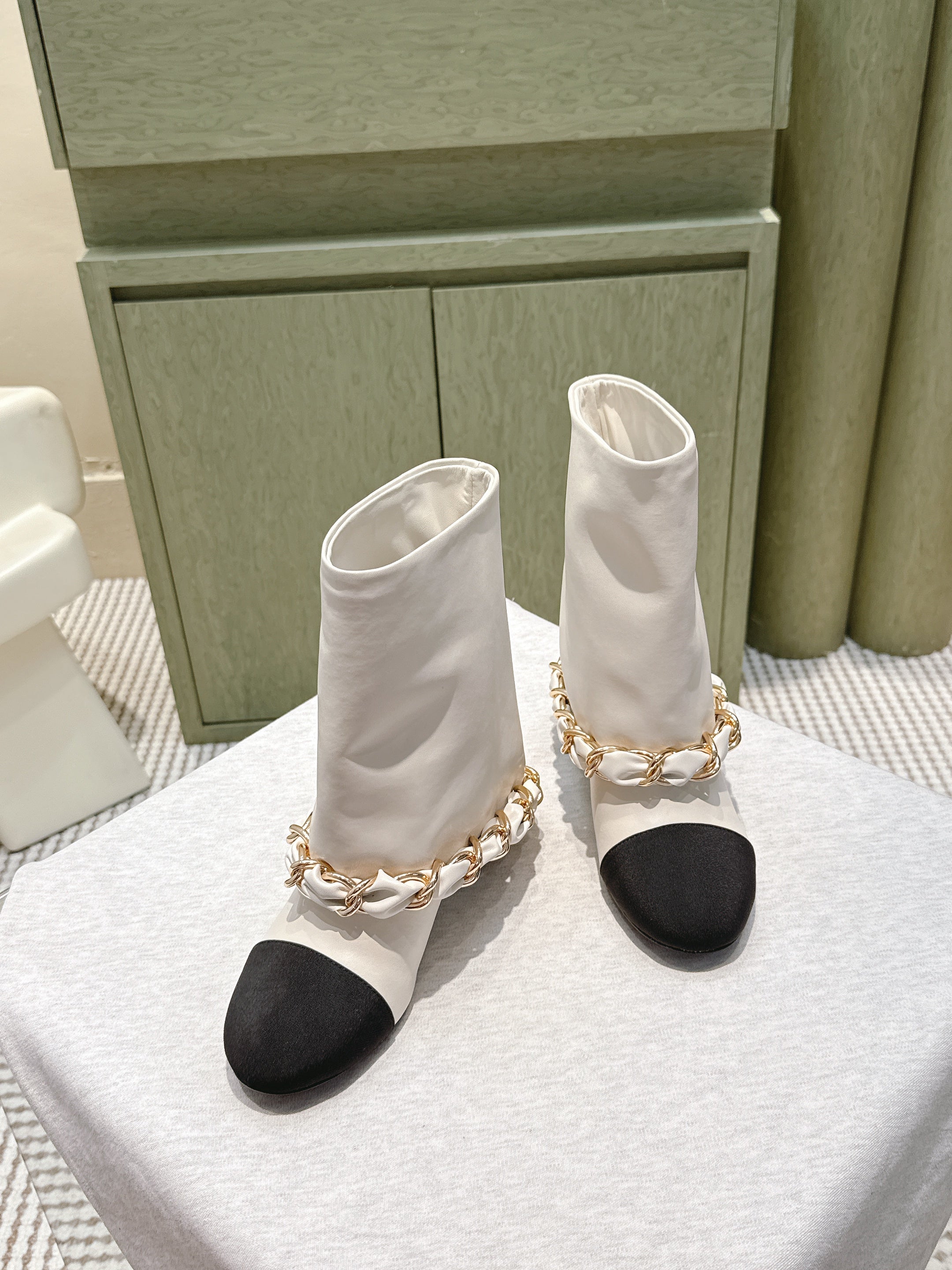 CHANEL 25S CALF-LENGTH BOOTS 45MM IN WHITE AND BLACK CALFSKIN GOLD HARDWARE