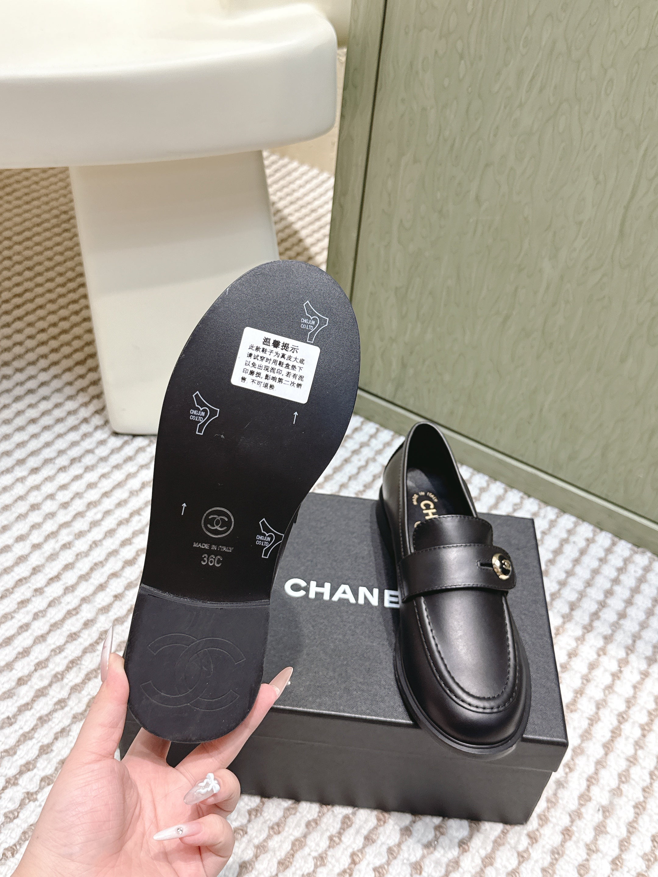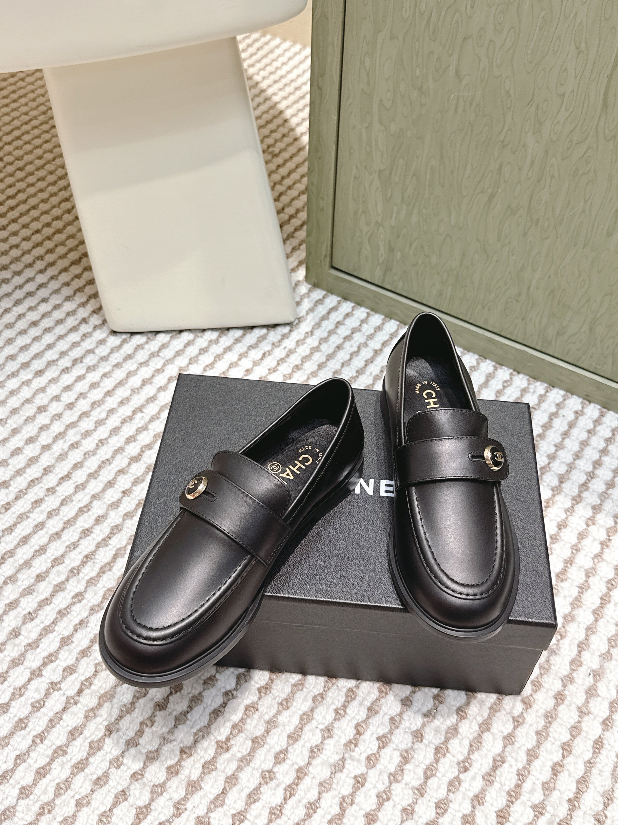 CHANEL 25S GODDESS FLAT LOAFERS IN BLACK CALFSKIN GOLD HARDWARE
