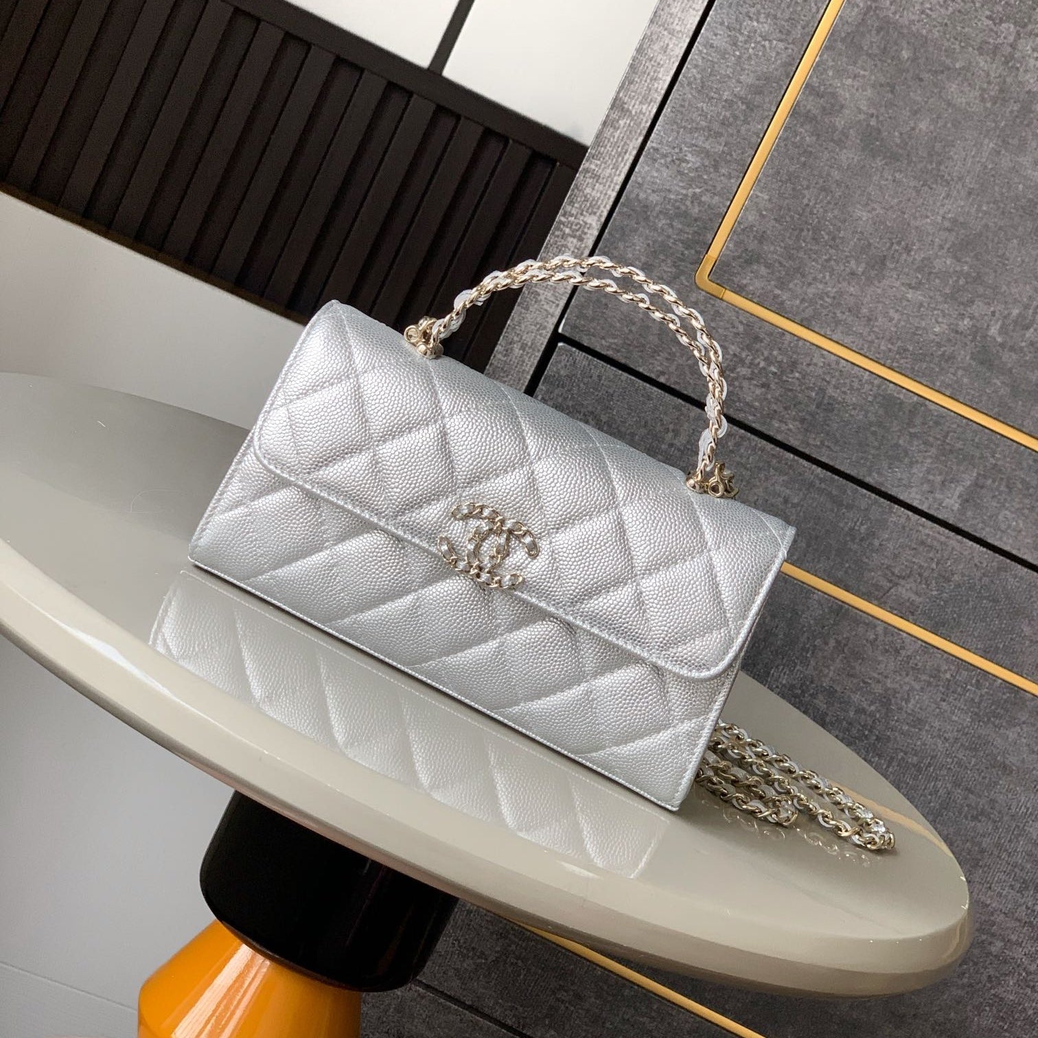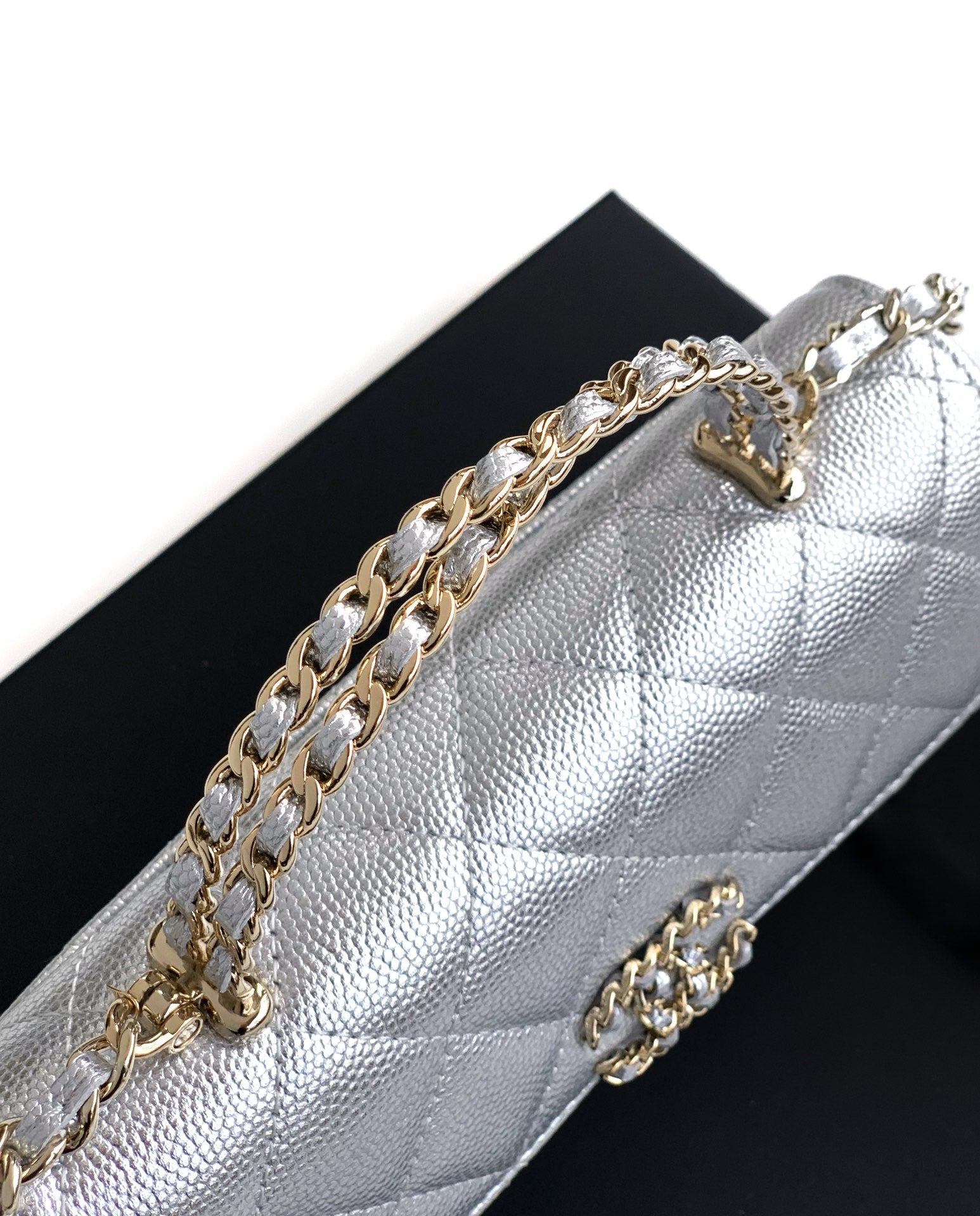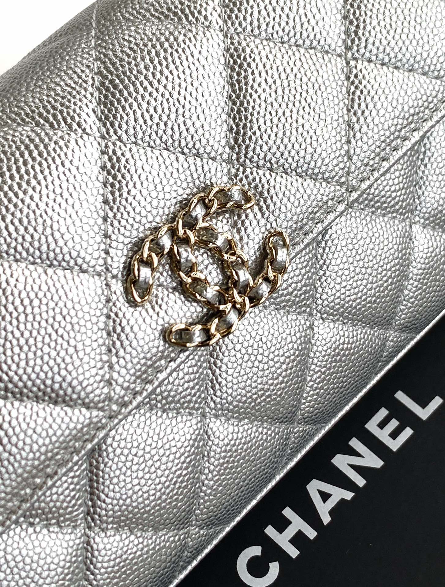 CHANEL 25S KELLY BAG 18 IN SILVER CAVIAR LEATHER WITH GOLD HARDWARE STYLE 2