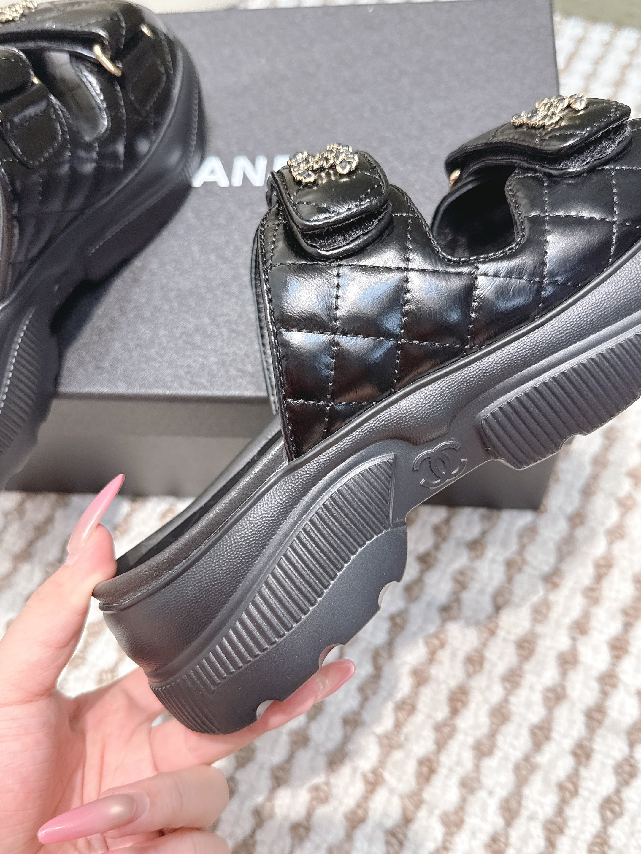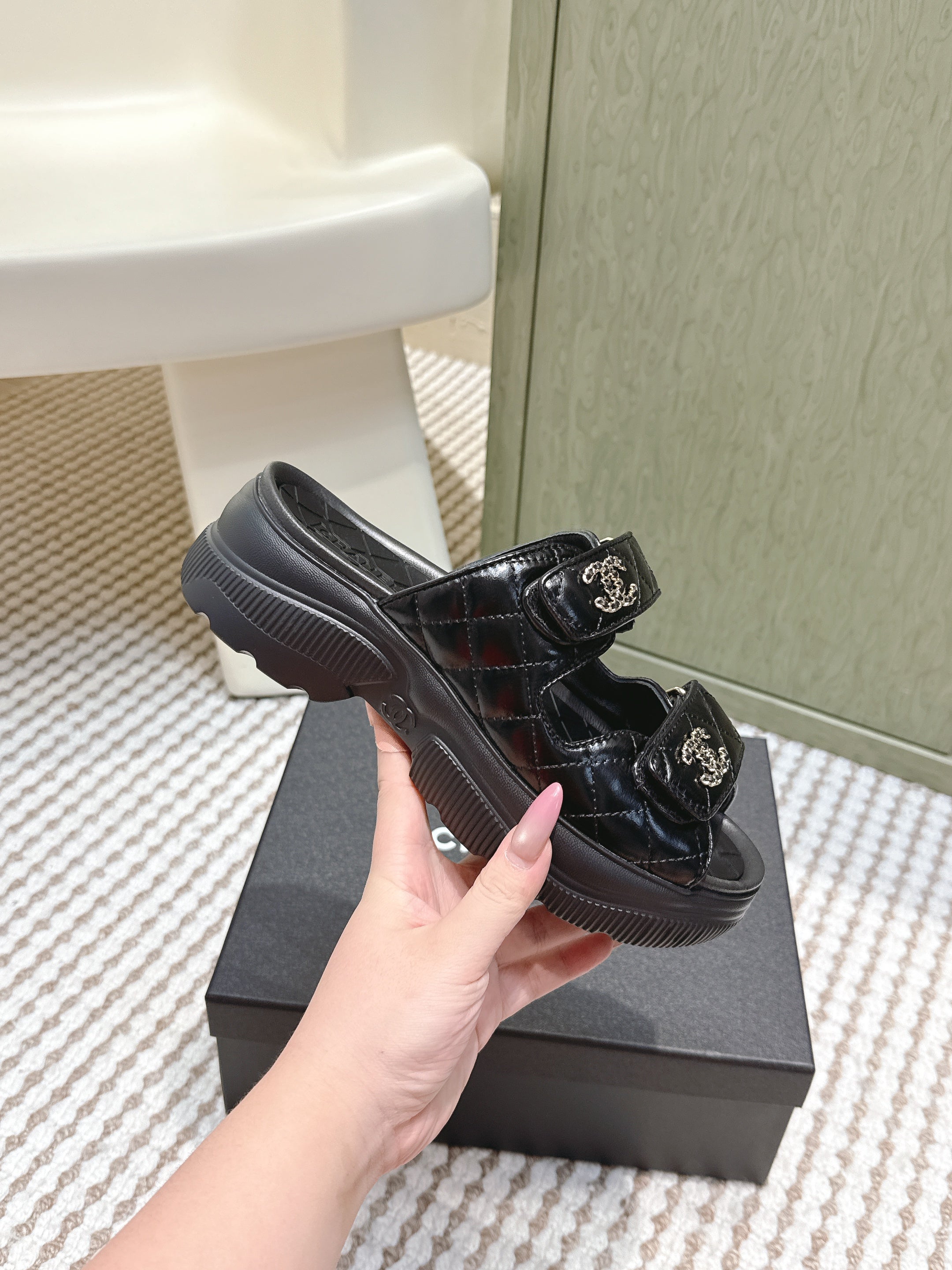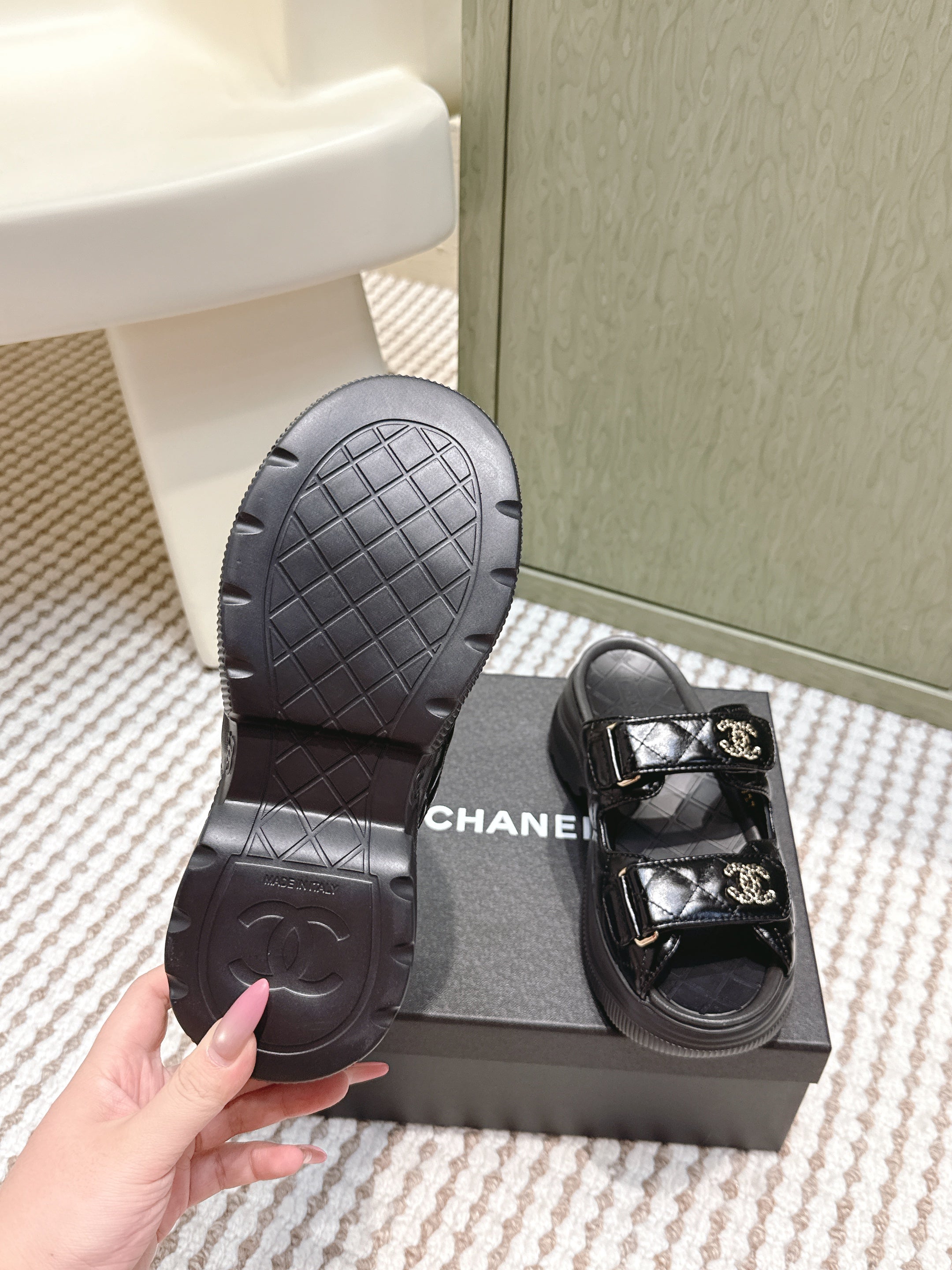 CHANEL 25S STRAP SANDALS IN BLACK PATENT CALFSKIN SILVER HARDWARE