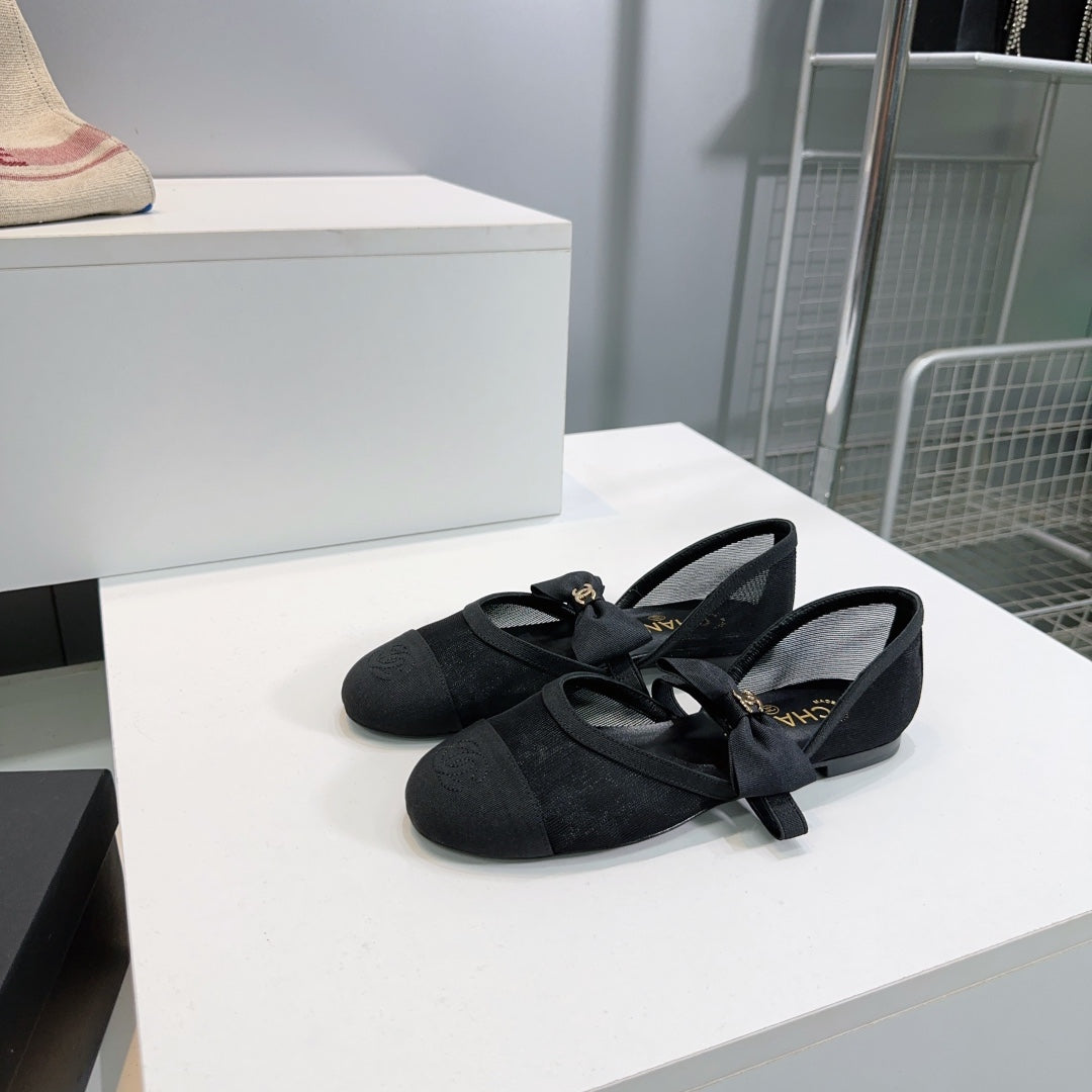 CHANEL FLAT MARY JANE SHOES 25S IN BLACK MESH FABRIC EMBOSSED LOGO WITH BOW