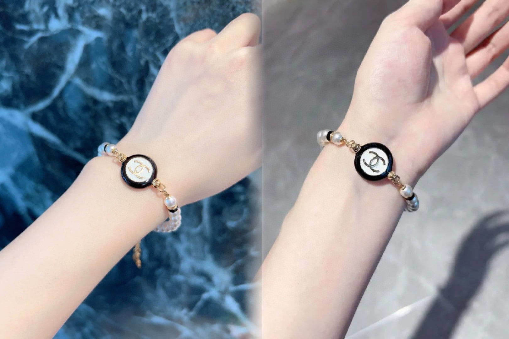 Classic CC bracelet with faux pearls and black resin.