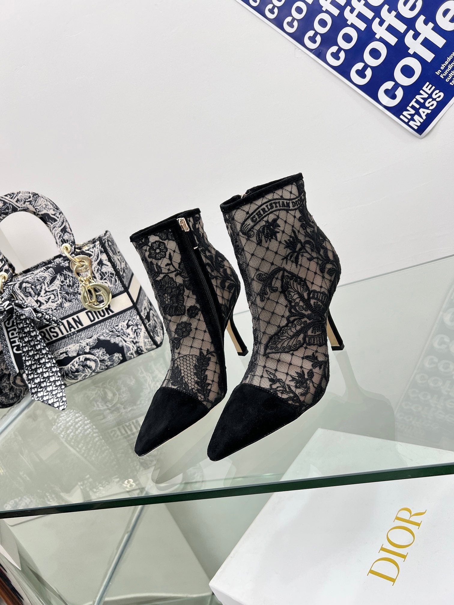 DIOR 25S POINTED-TOE ANKLE BOOTS 95 MM IN BLACK MESH TULLE AND SUEDE STYLE 1