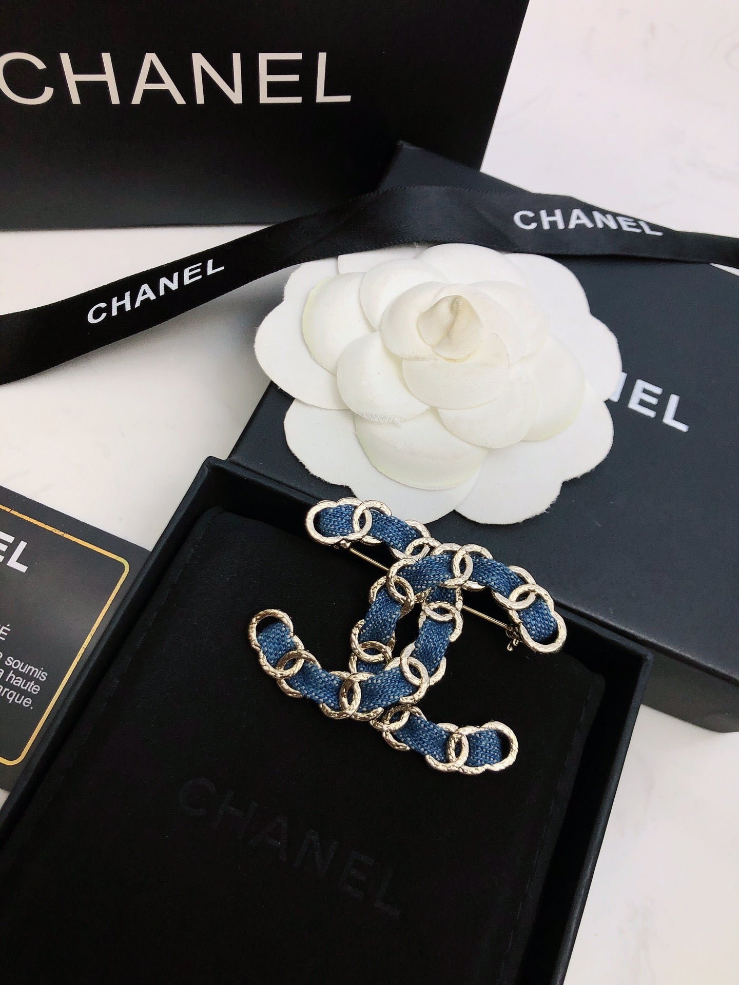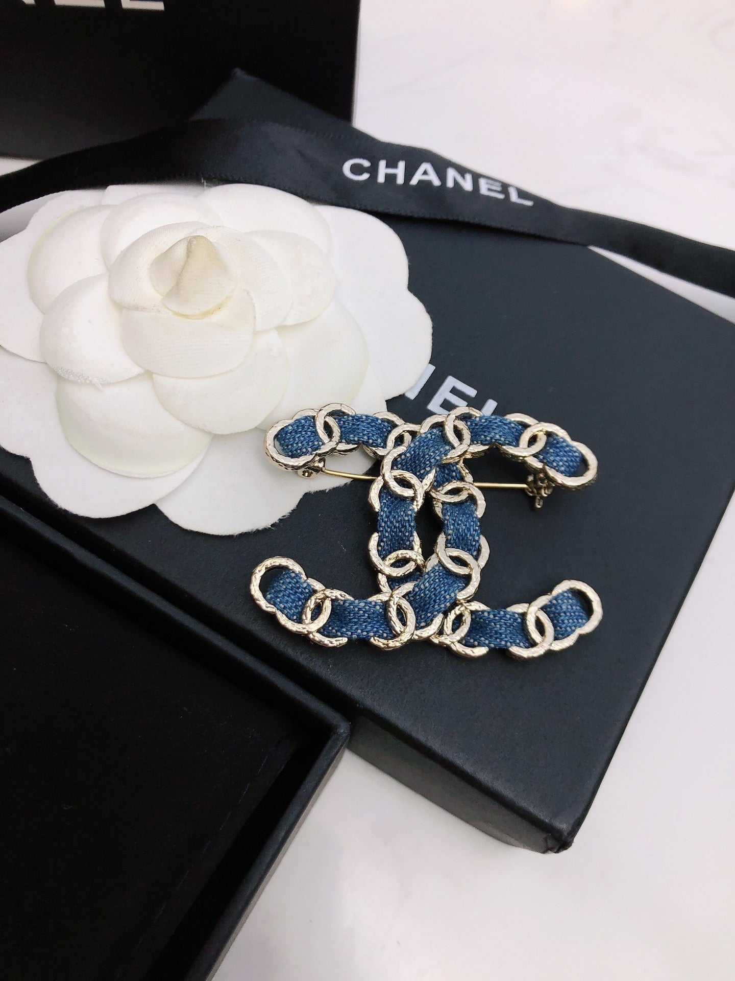 DOUBLE C BROOCH IN GOLD METAL WITH BLUE DENIM THREADED CHAIN