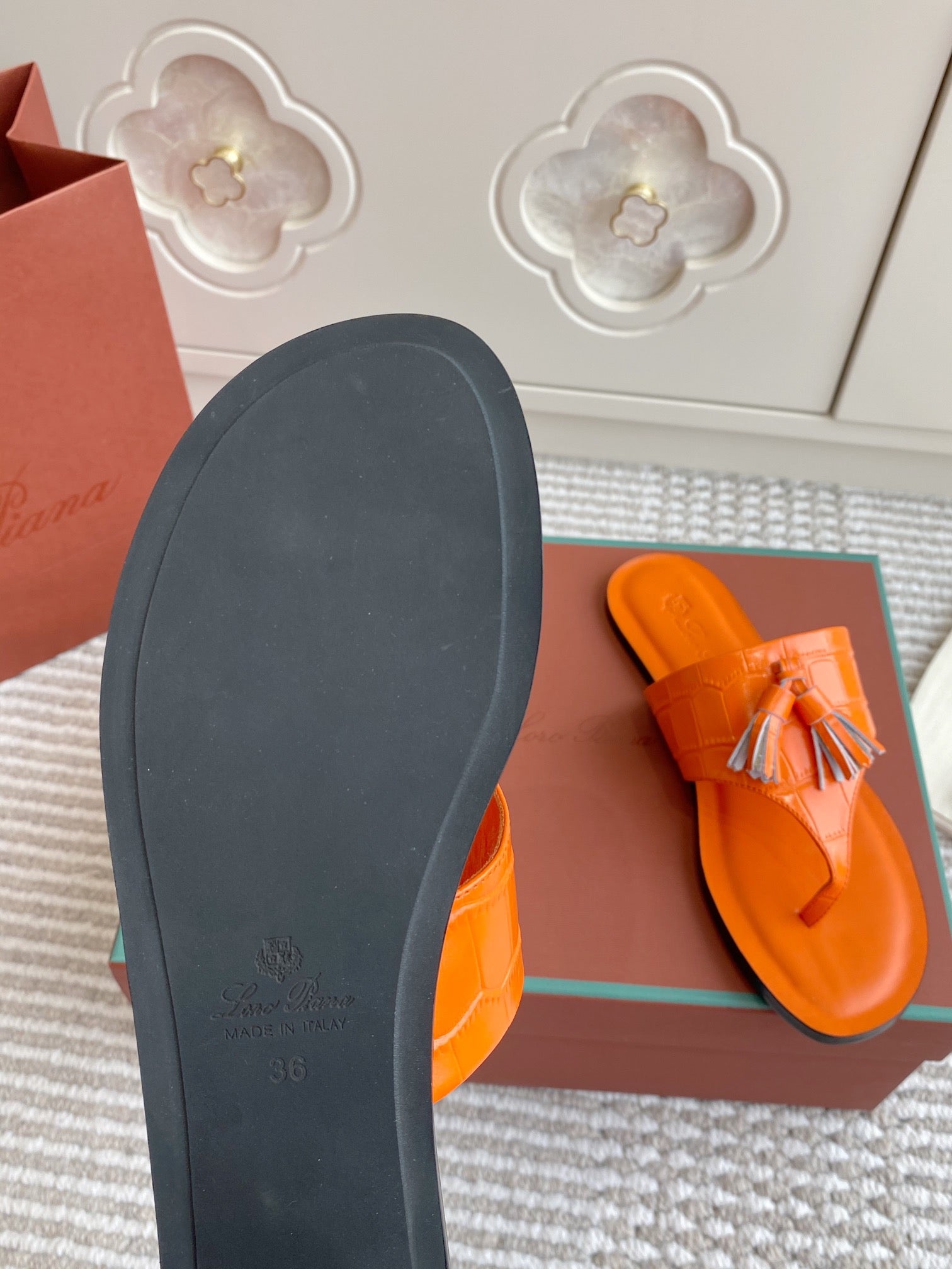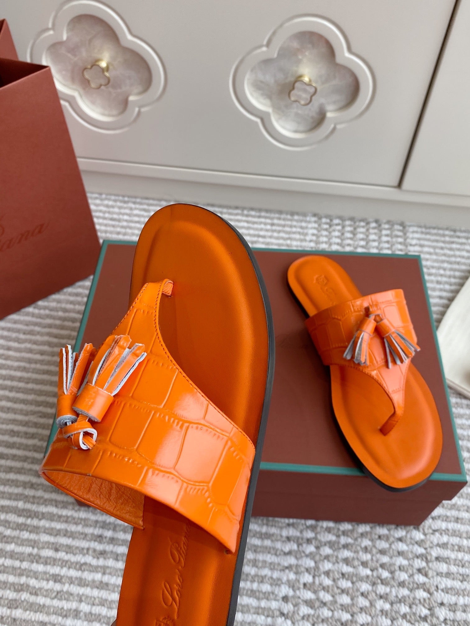 FLIP FLOPS IN ORANGE LAMBSKIN SNAKE EMBOSSING