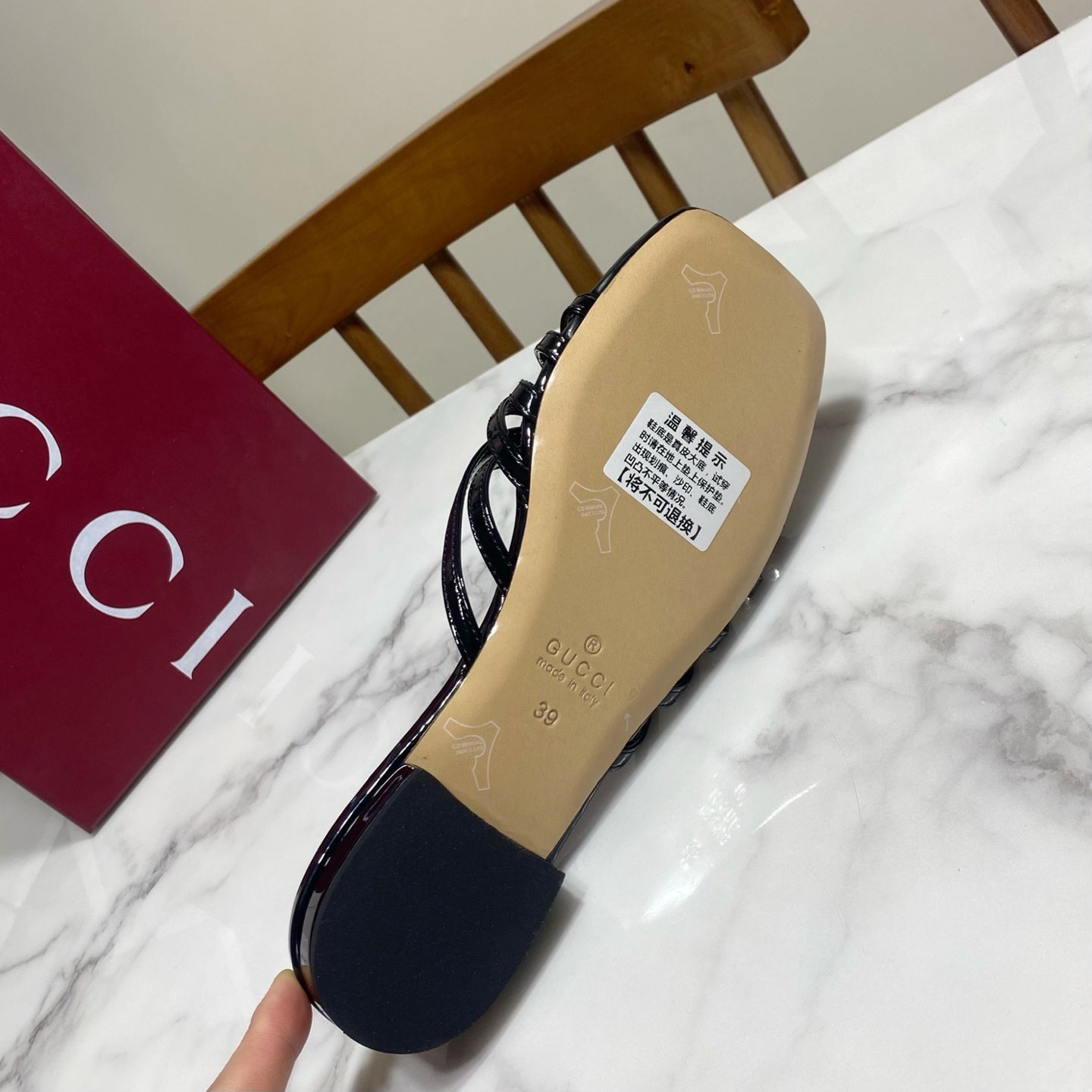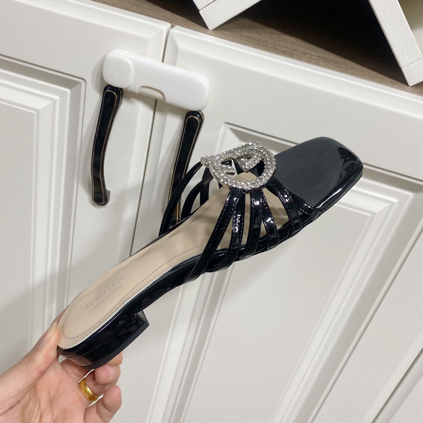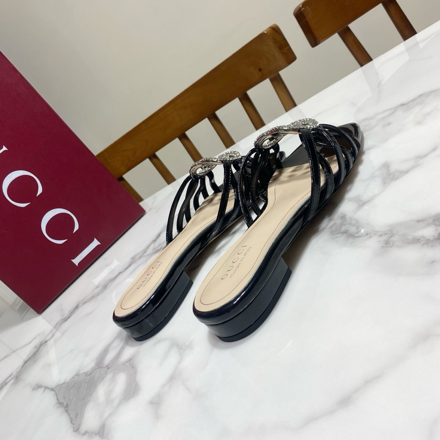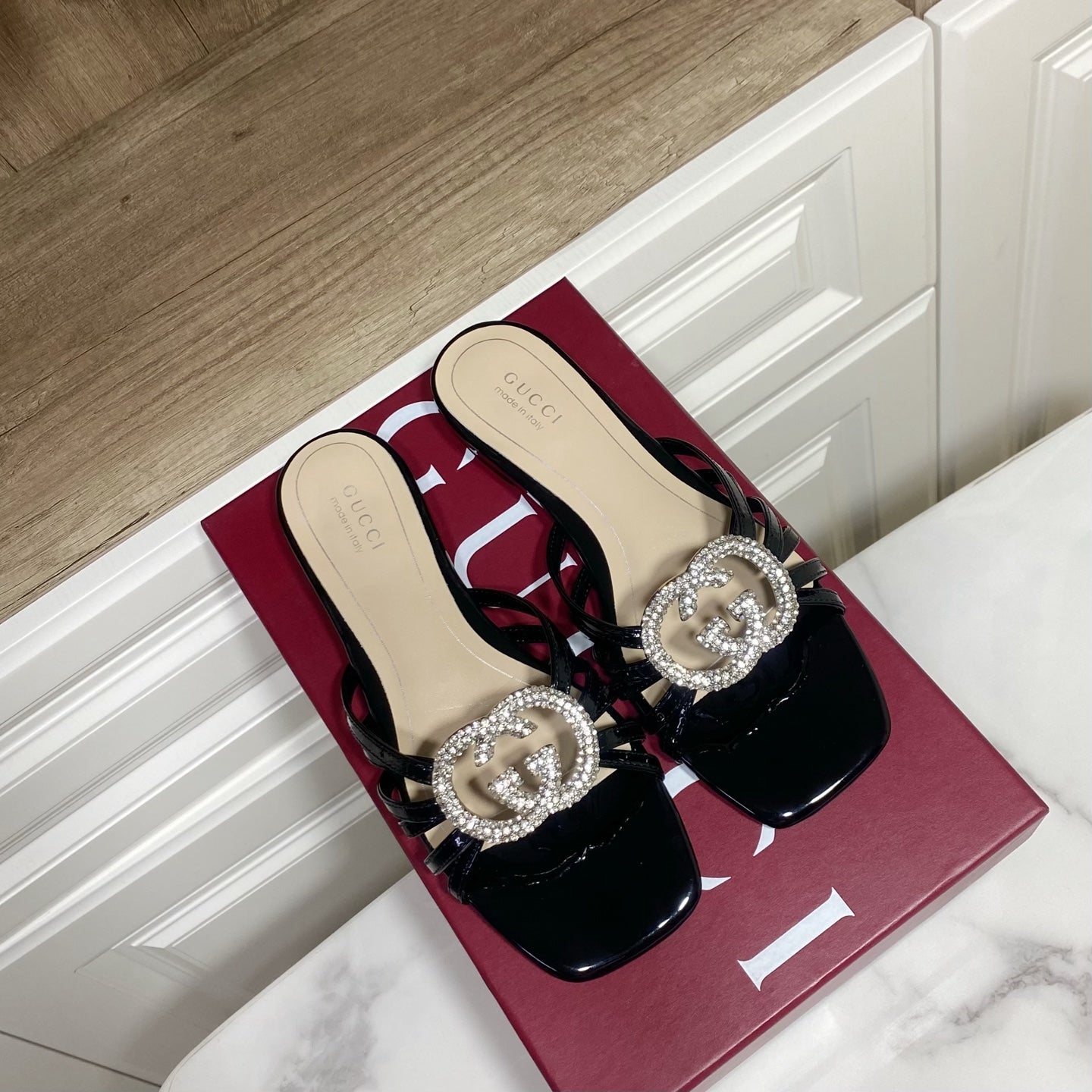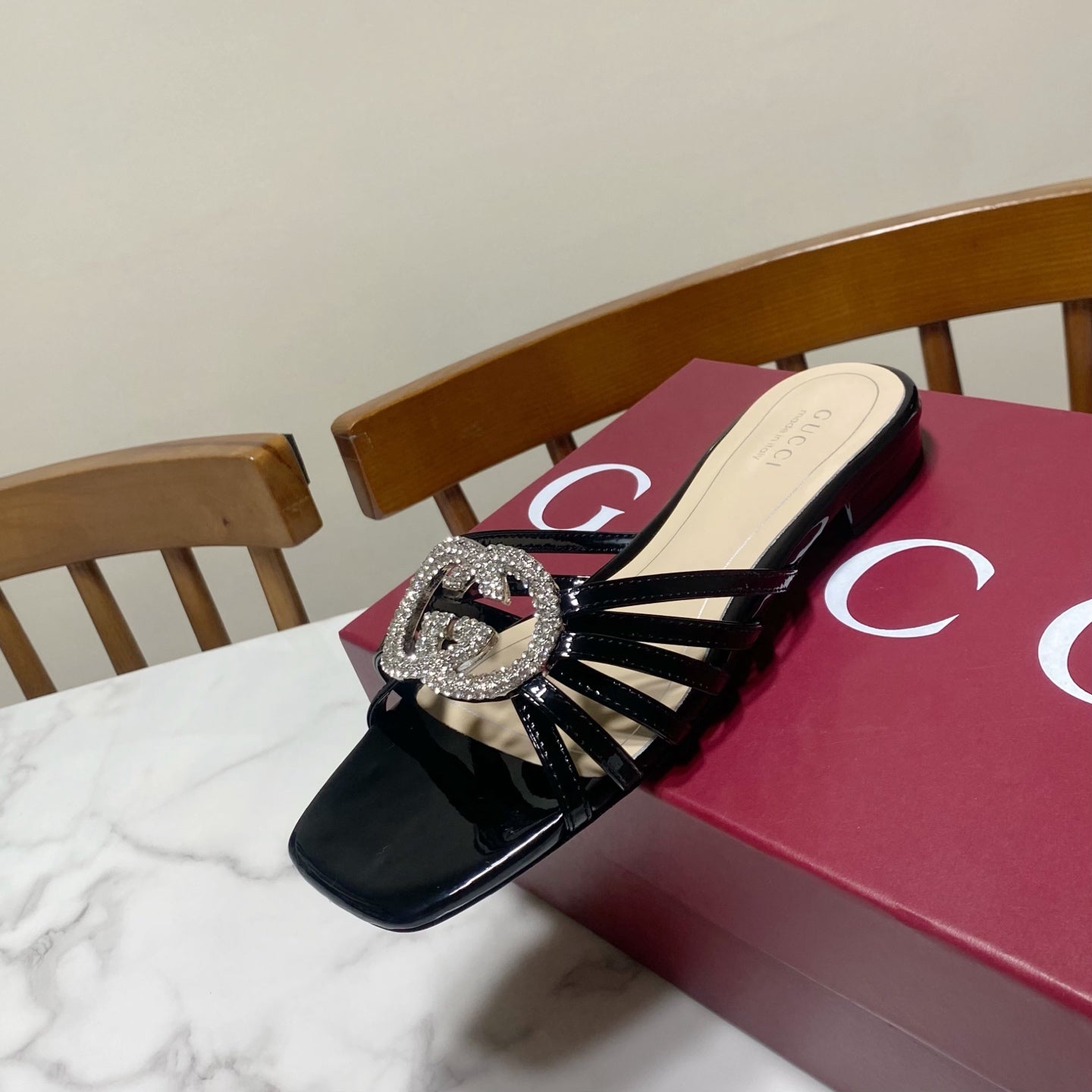 GUCCI 26S FLAT SLIDES IN BLACK CALFSKIN WITH CRYSTAL