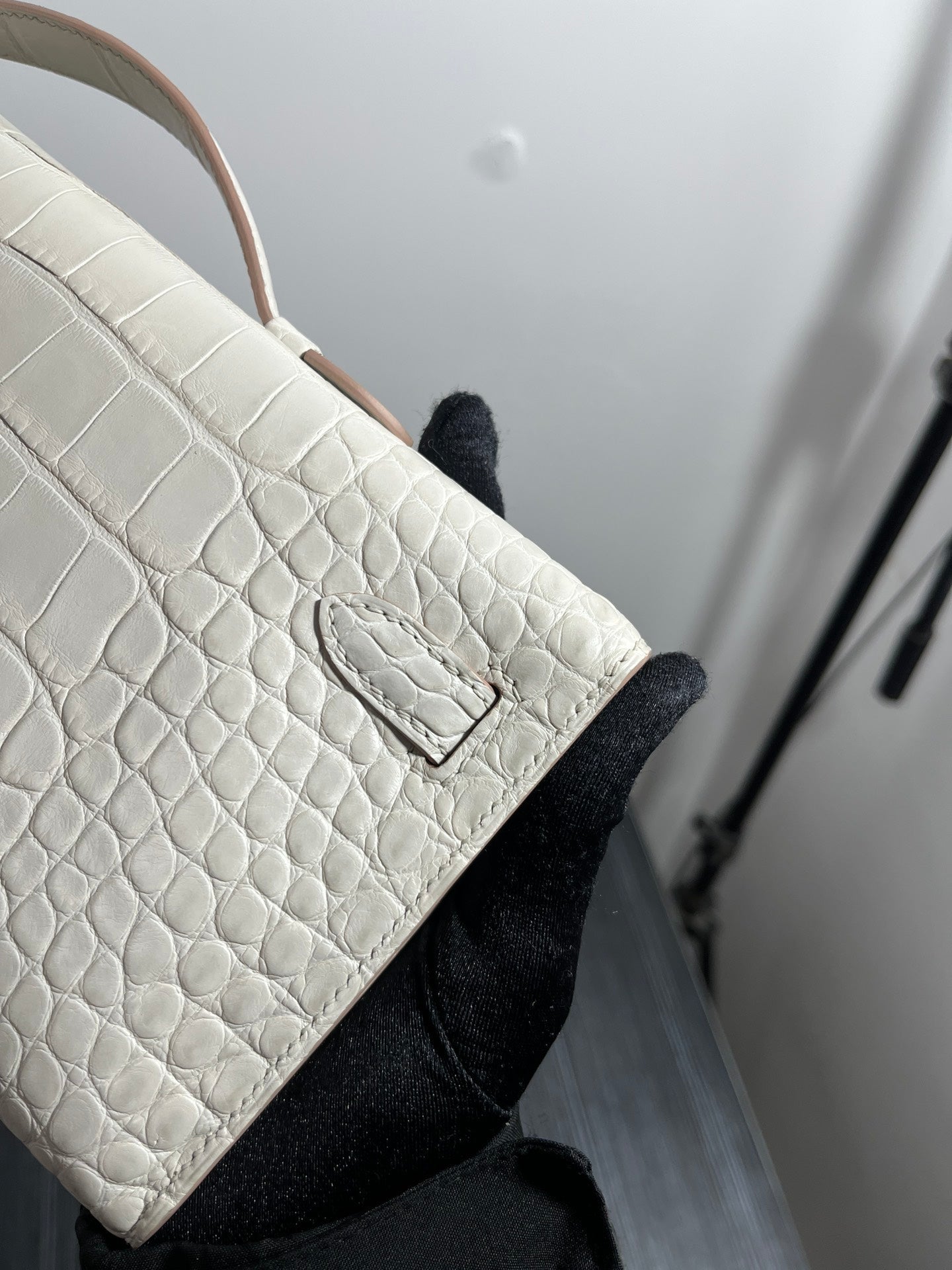 KELLY CUT 31 IN WHITE SHINNY ALLIGATOR LEATHER WITH GOLD HARDWARE
