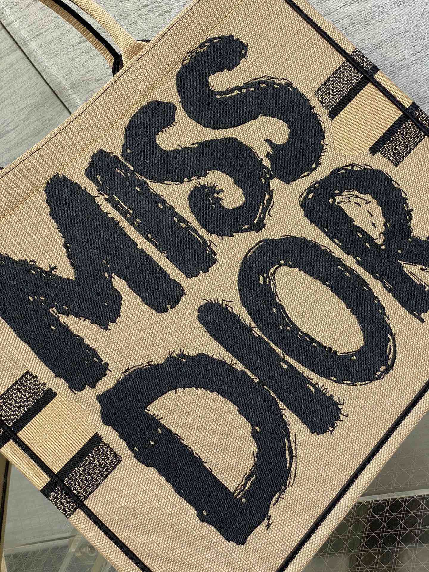 LARGE BOOK TOTE 42 BEIGE AND BLACK MISS DIOR GRAFFITI EMBROIDERY