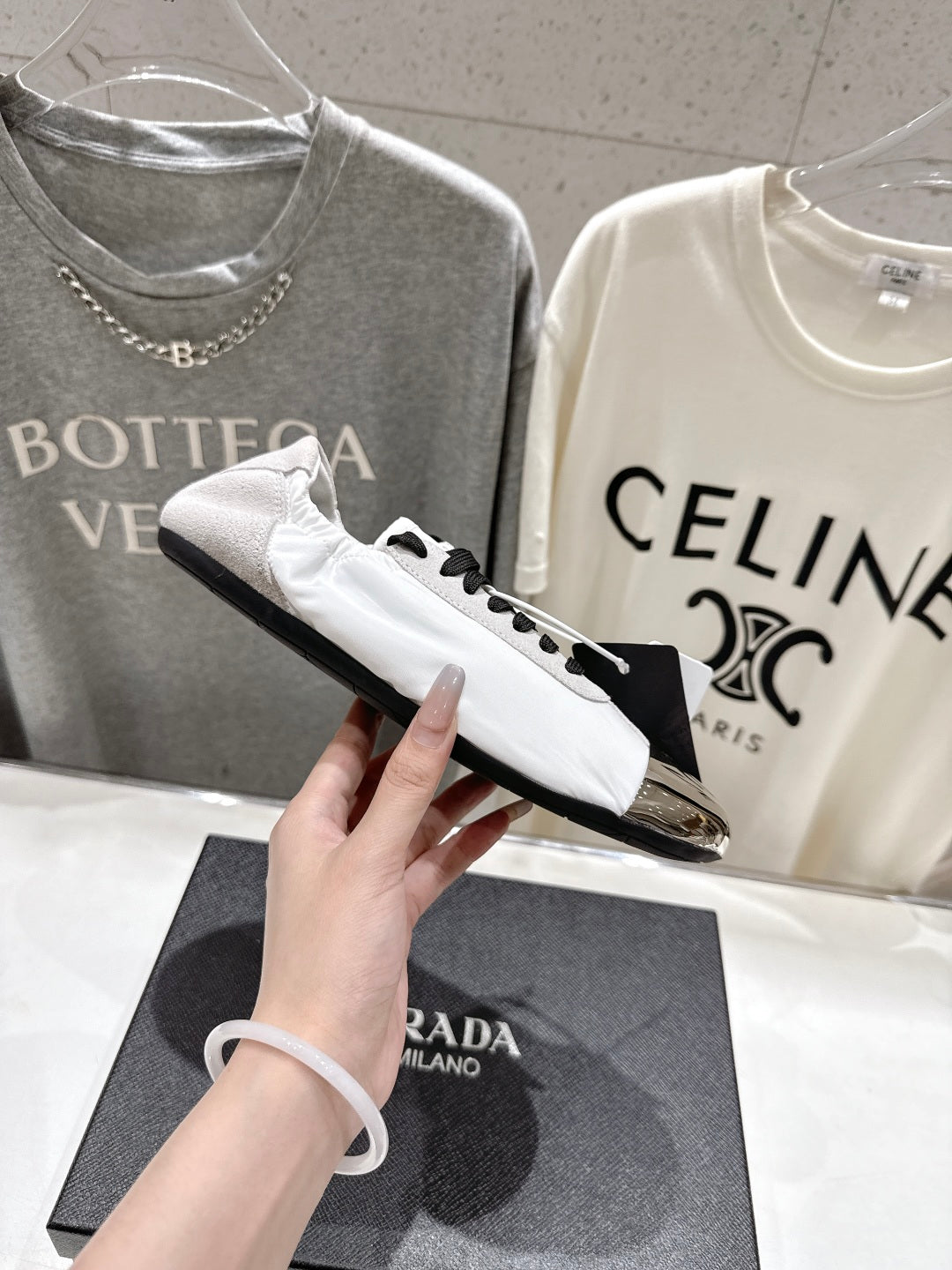 PRADA 25S COLLAPSE RE NYLON AND SUEDE SNEAKERS IN WHITE WITH METAL TOECAP