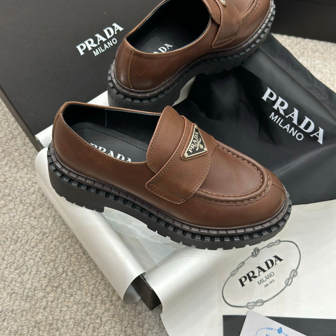 PRADA 25S LOAFER 50MM IN DARK BROWN CALFSKIN LOGO