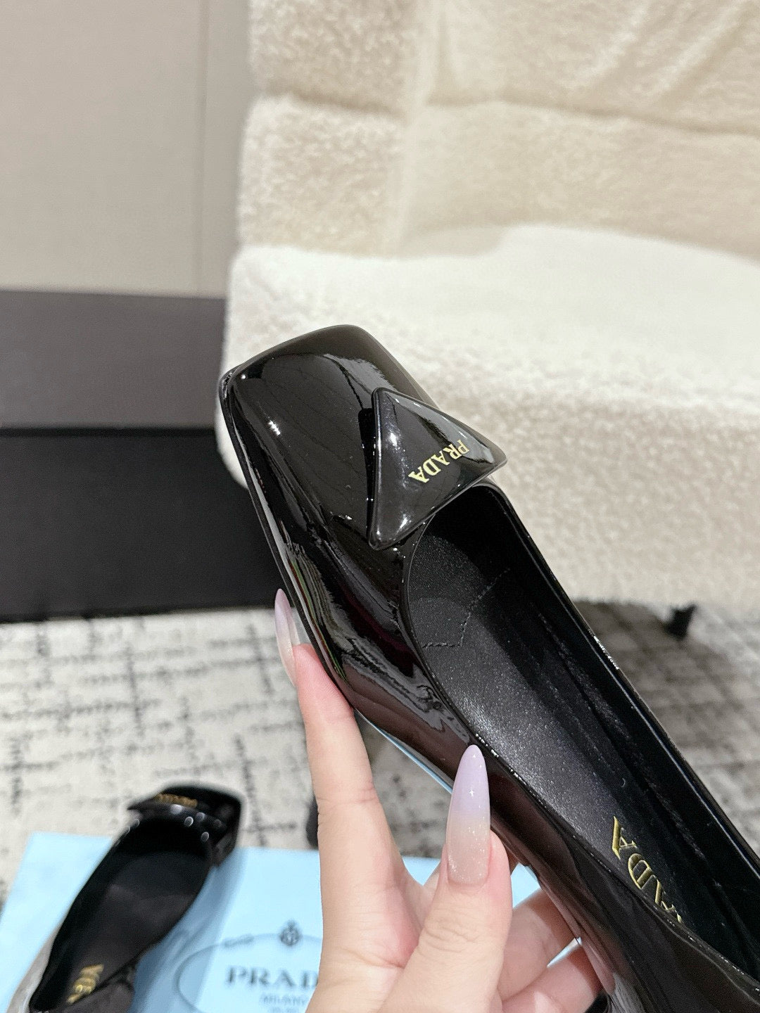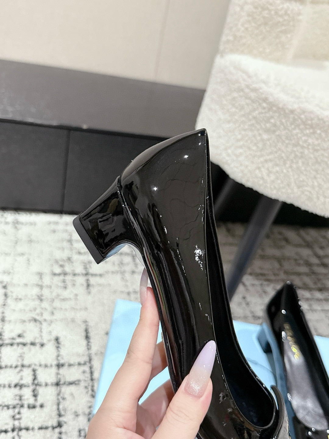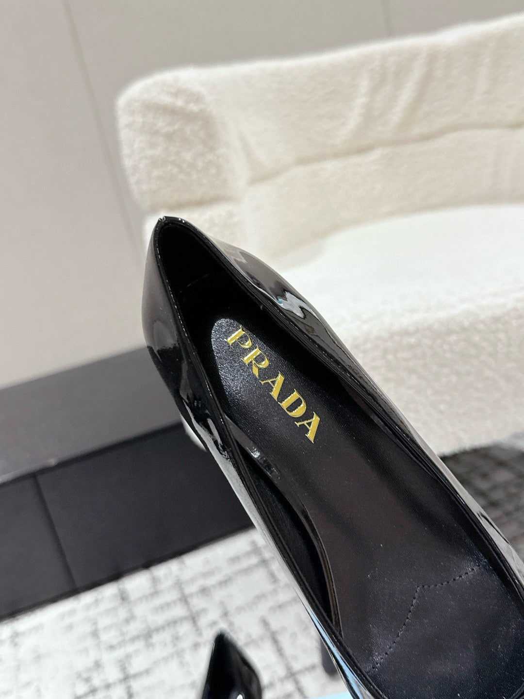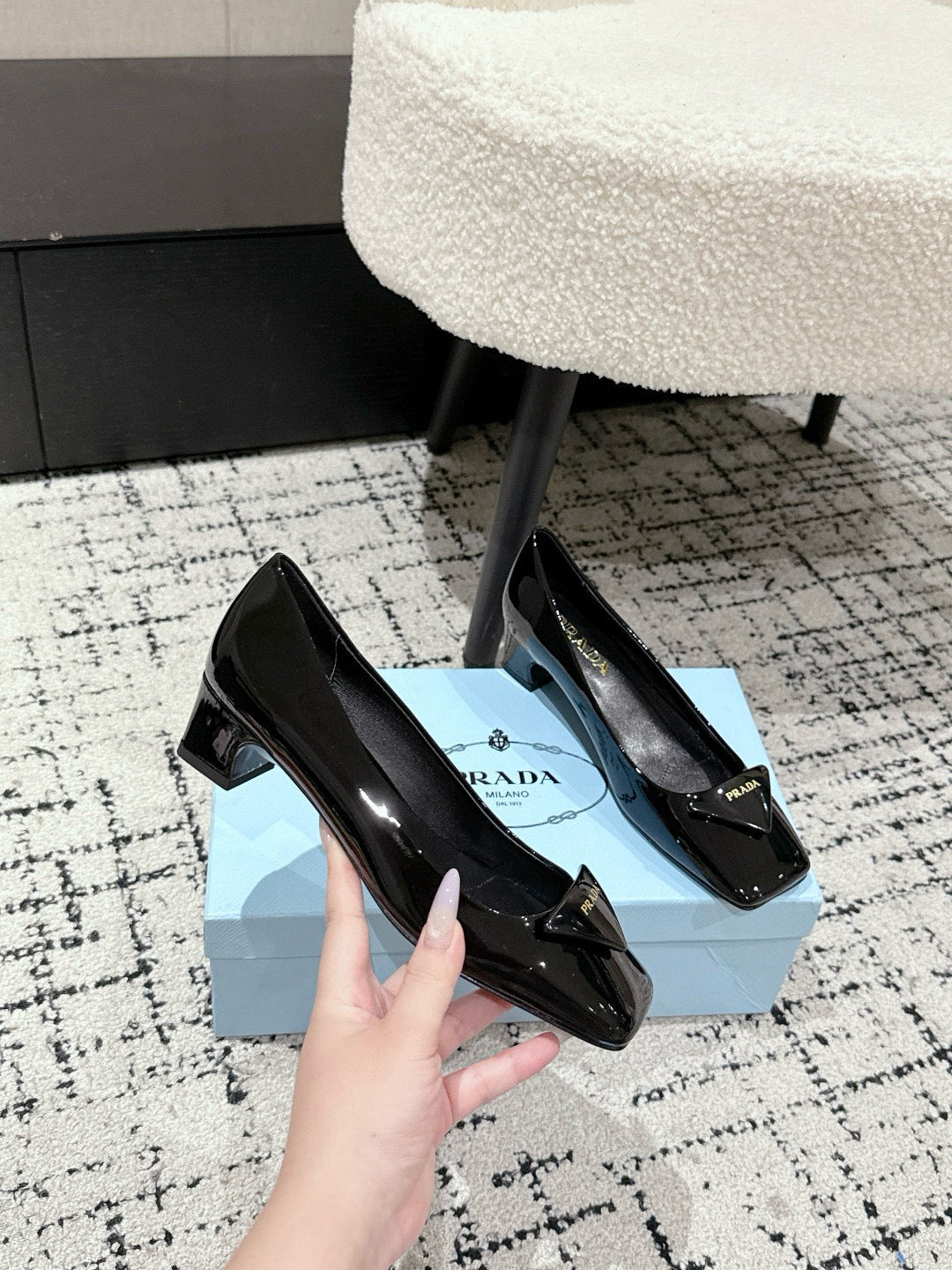 PRADA 25S SQUARE TOE HIGH HEELS IN BLACK GLOSSY CALFSKIN
