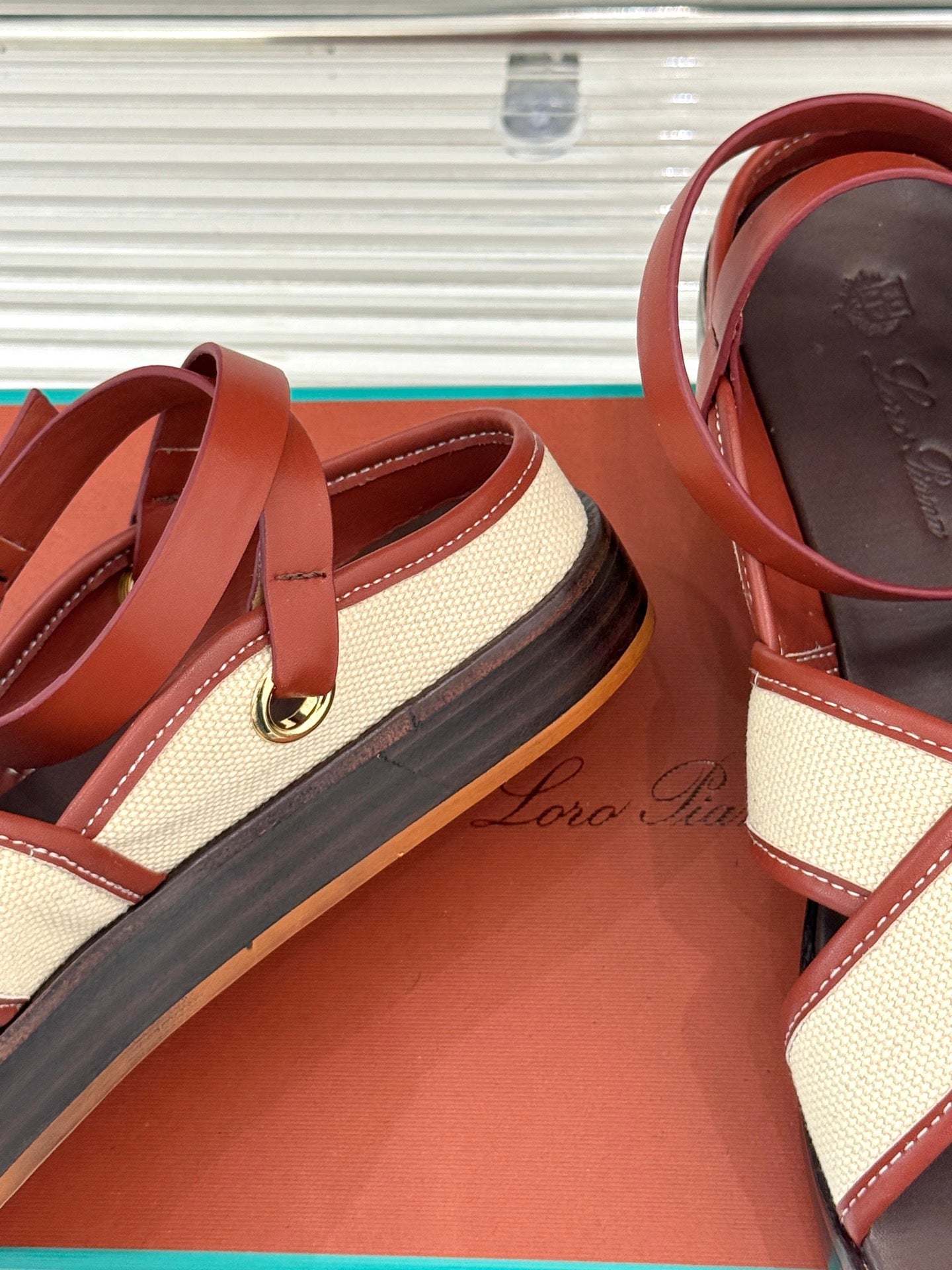 SANDALS THICK SOLE CROSS STRAP IN BEIGE FABRIC AND ORANGE CALFSKIN