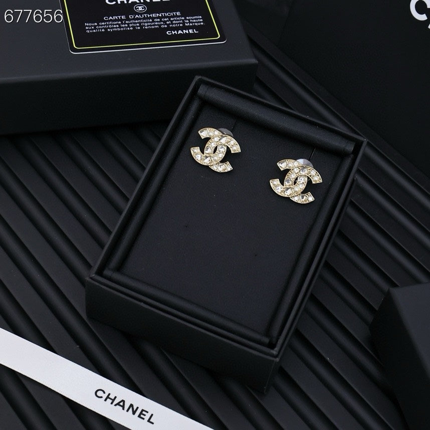 STUD EARRINGS IN GOLD METAL PEARLY WHITE AND CRYSTAL
