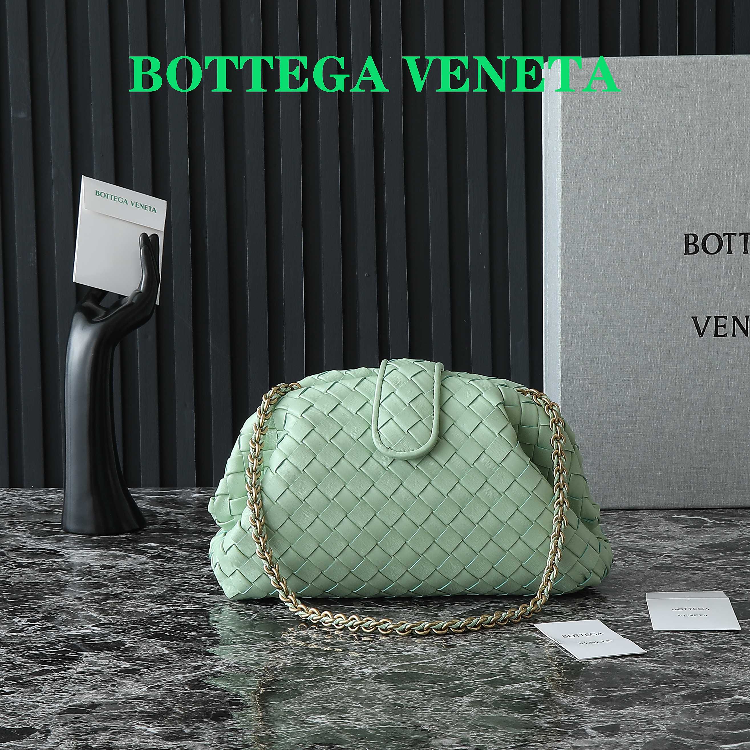 • Padded Intrecciato leather teen clutch with leather braided metal chain