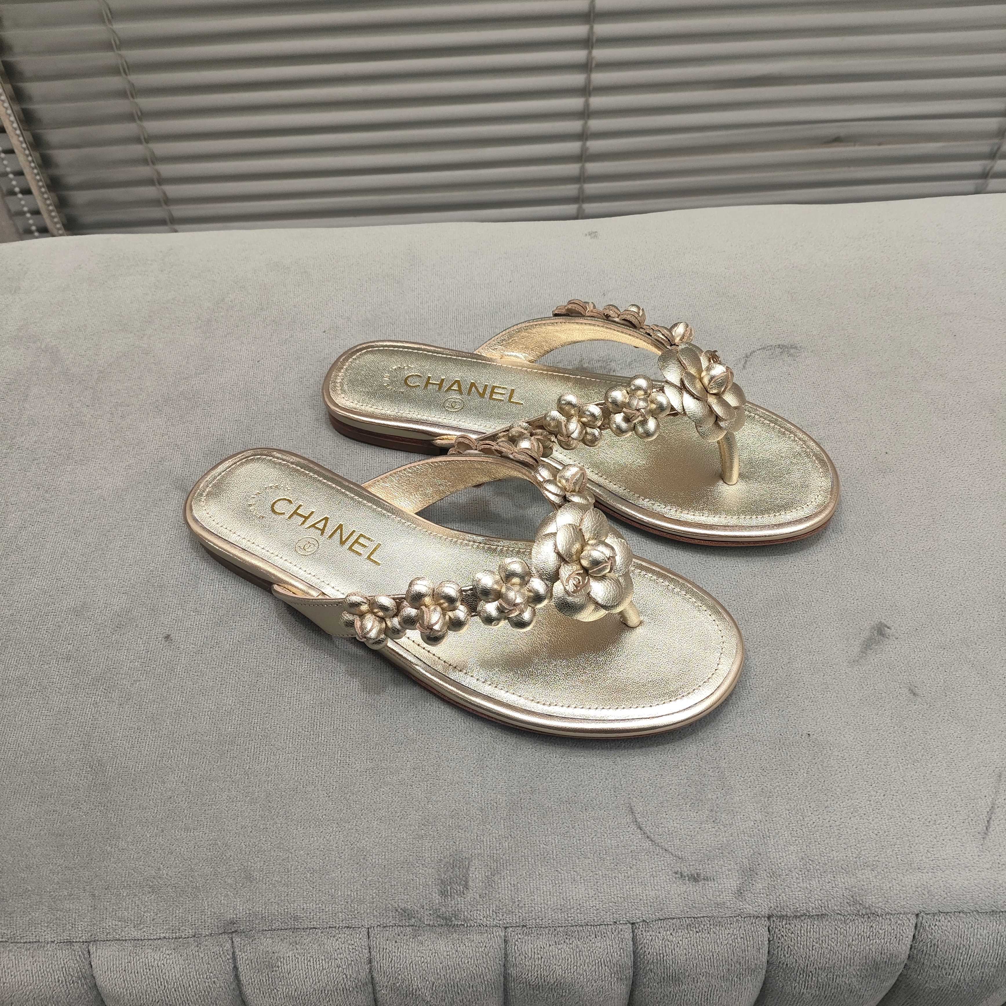 THONG SLIPPERS CAMELLIA IN GOLD PANTENT CALFSKIN
