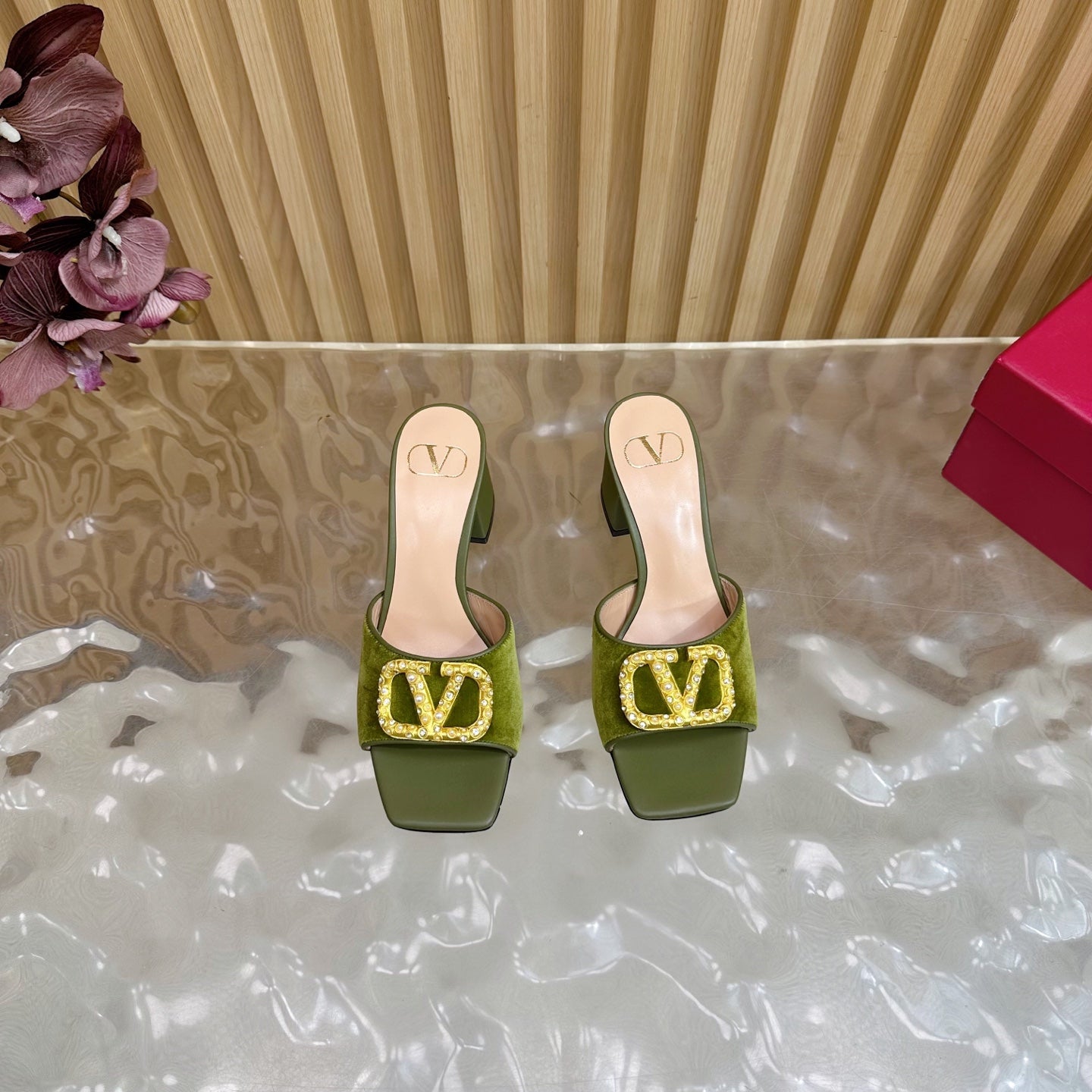 VALENTINO 25S HIGH-HEEL MULES 60 MM IN MOSS GREEN VELVET AND CALFSKIN WITH GOLD HARDWARE