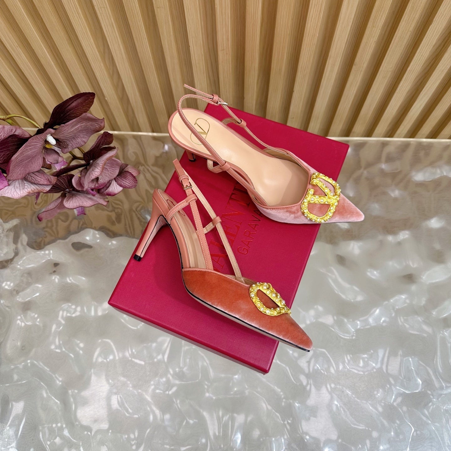 VALENTINO 25S HIGH-HEEL SLINGBACKS IN ORANGE VELVET WITH GOLD HARDWARE