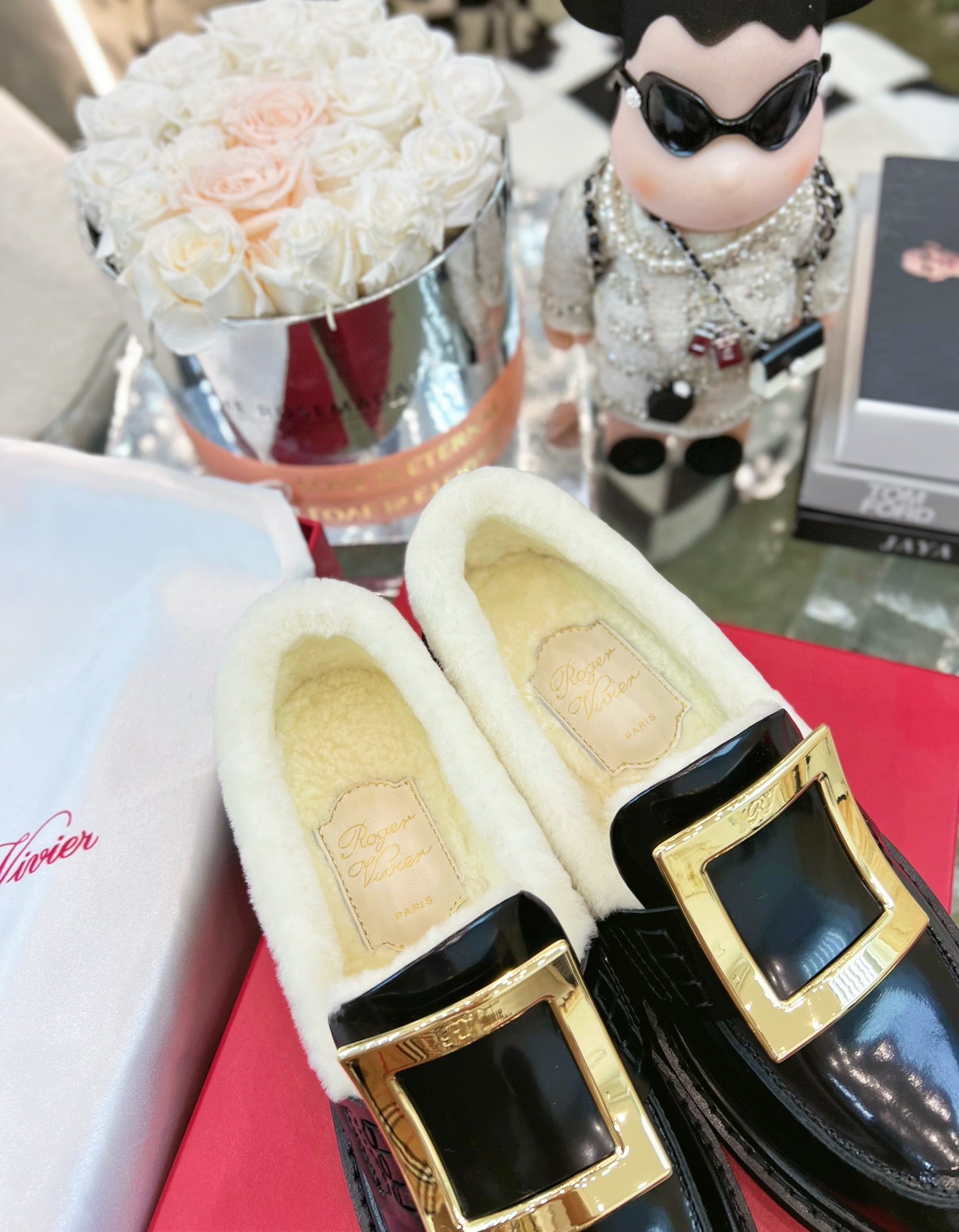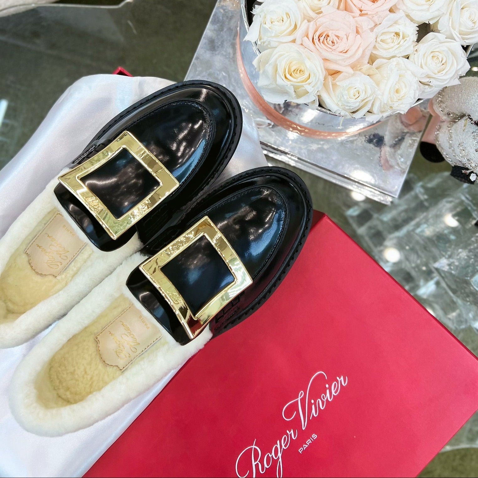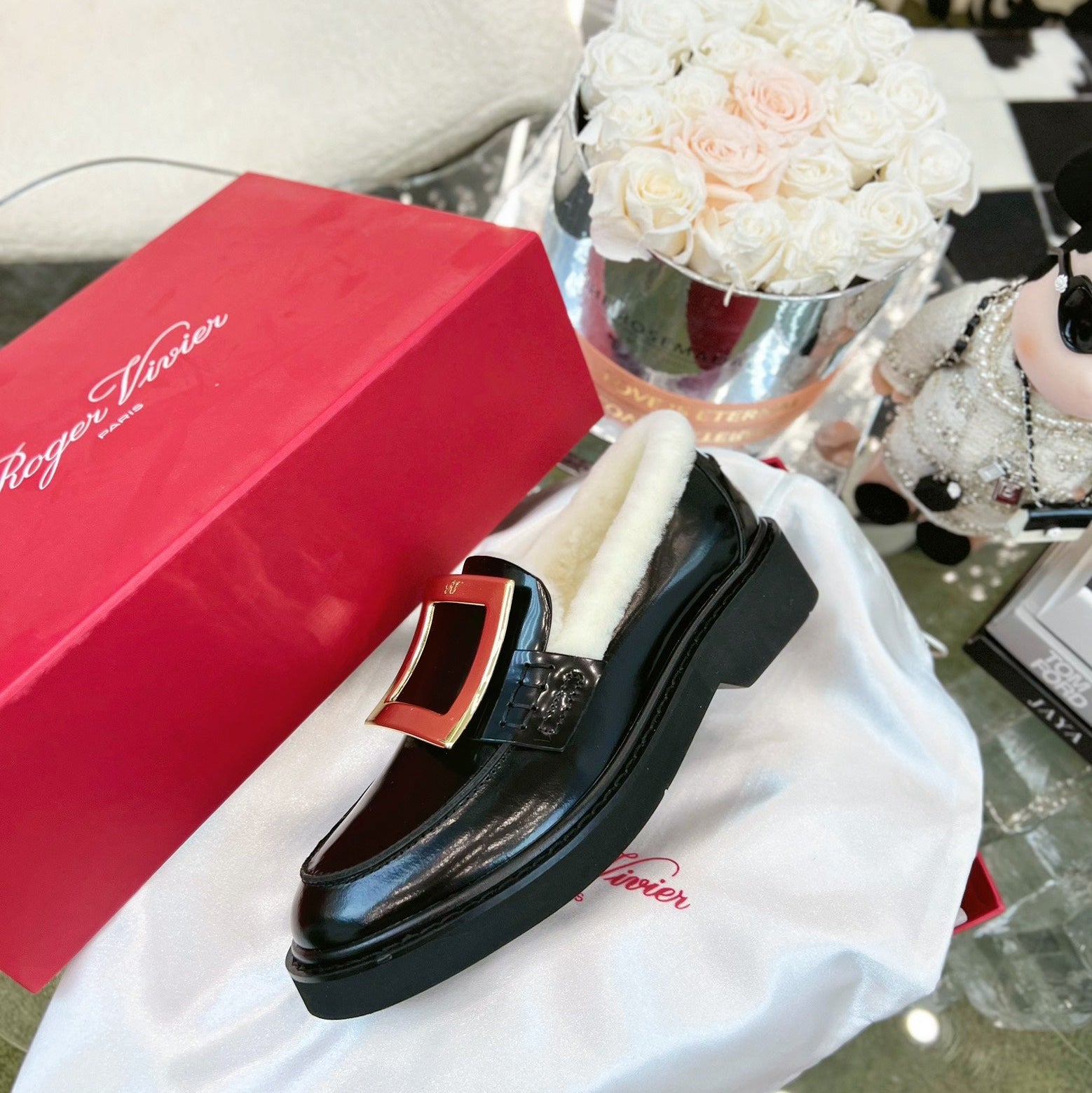 VIV' RANGERS LOAFERS IN BLACK PATENT CALFSKIN FLEECE LINING GOLD BUCKLE