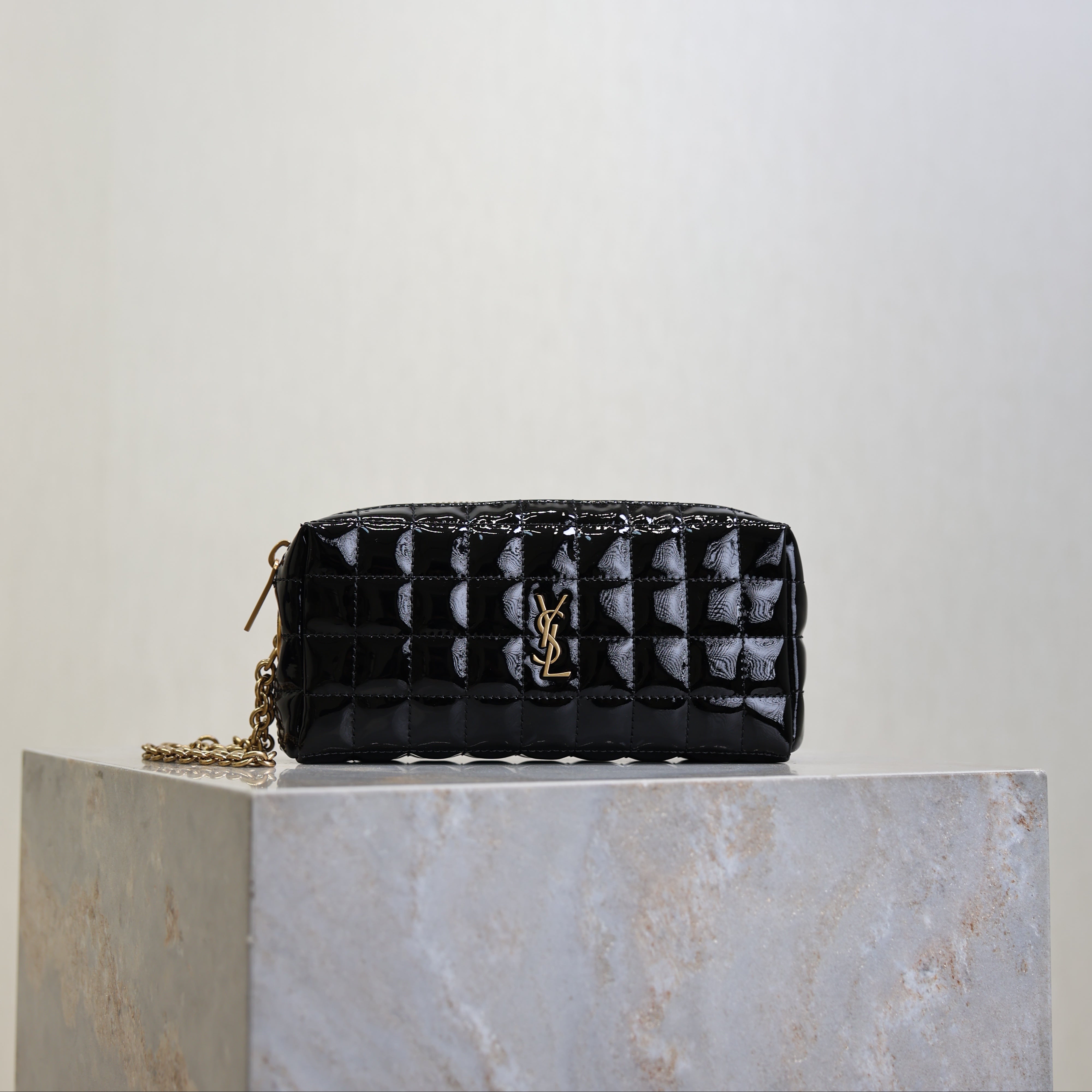 YSL 25S CASSANDRE MATELASSÉ CARRÉ POUCH ON CHAIN 18 IN BLACK SHINY CALFSKIN