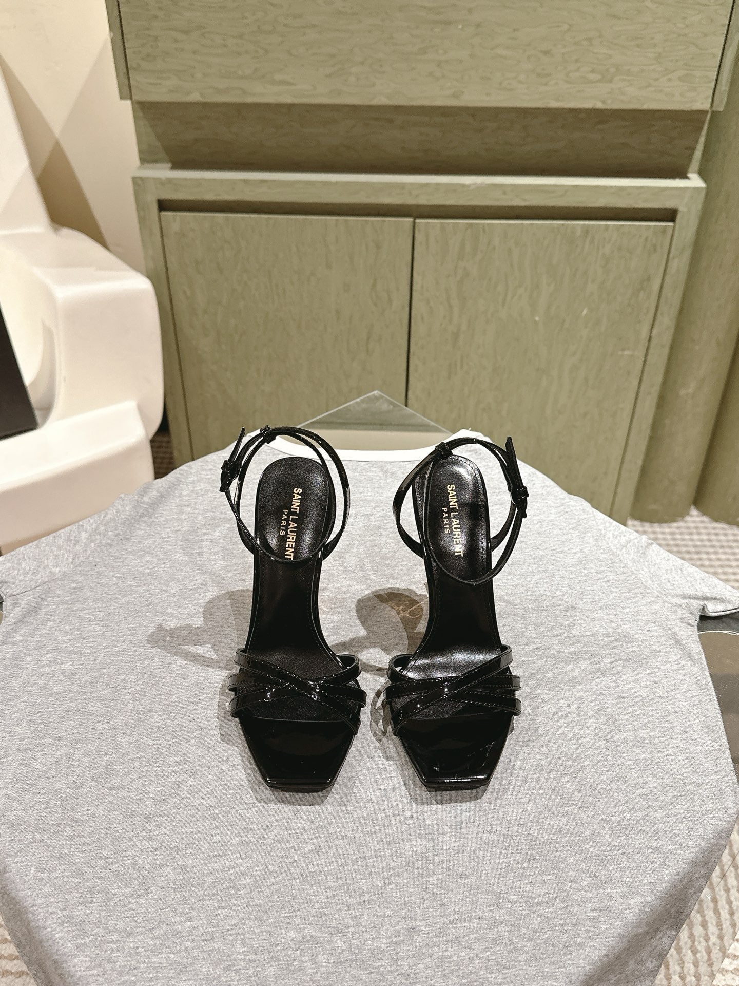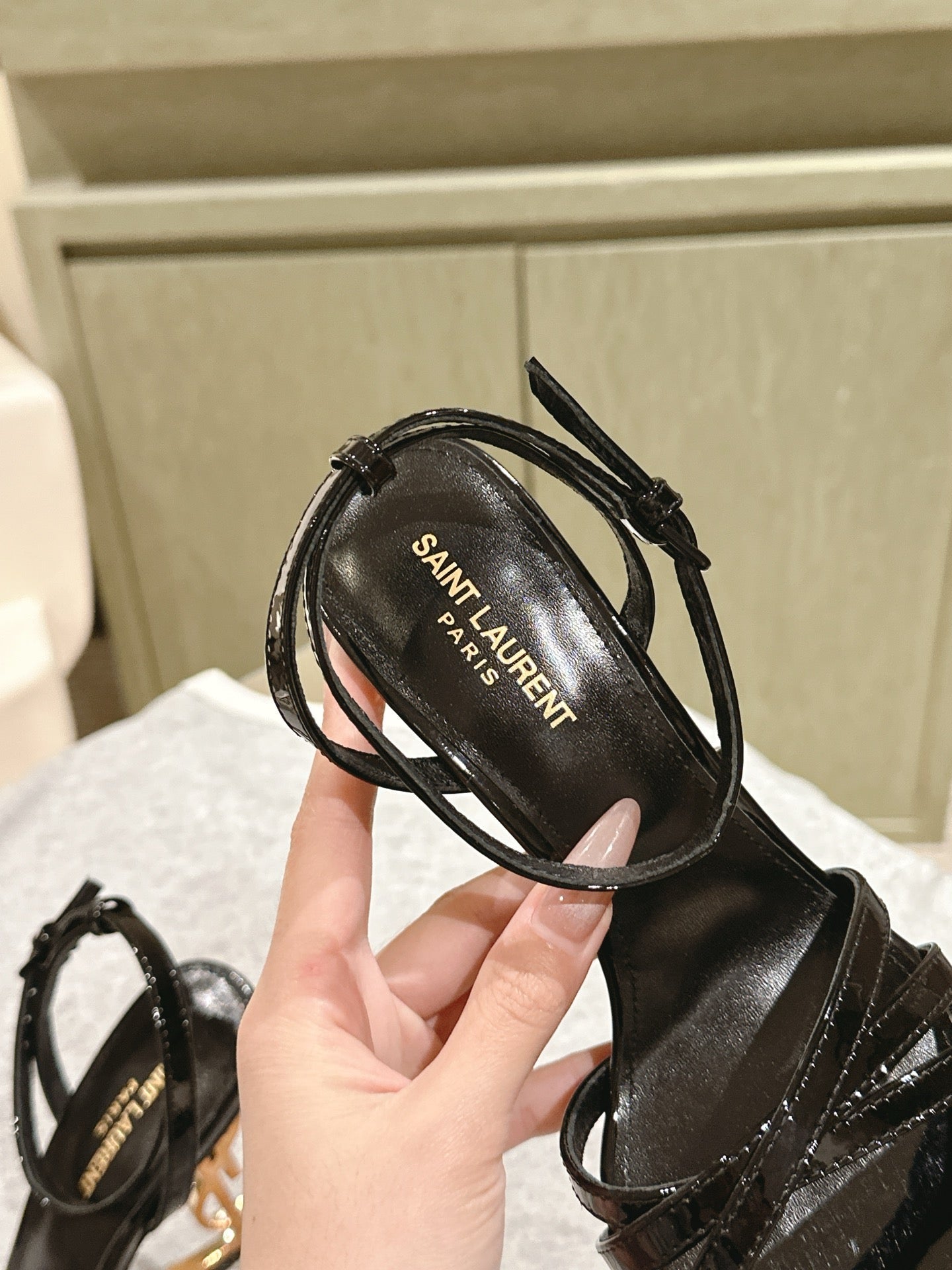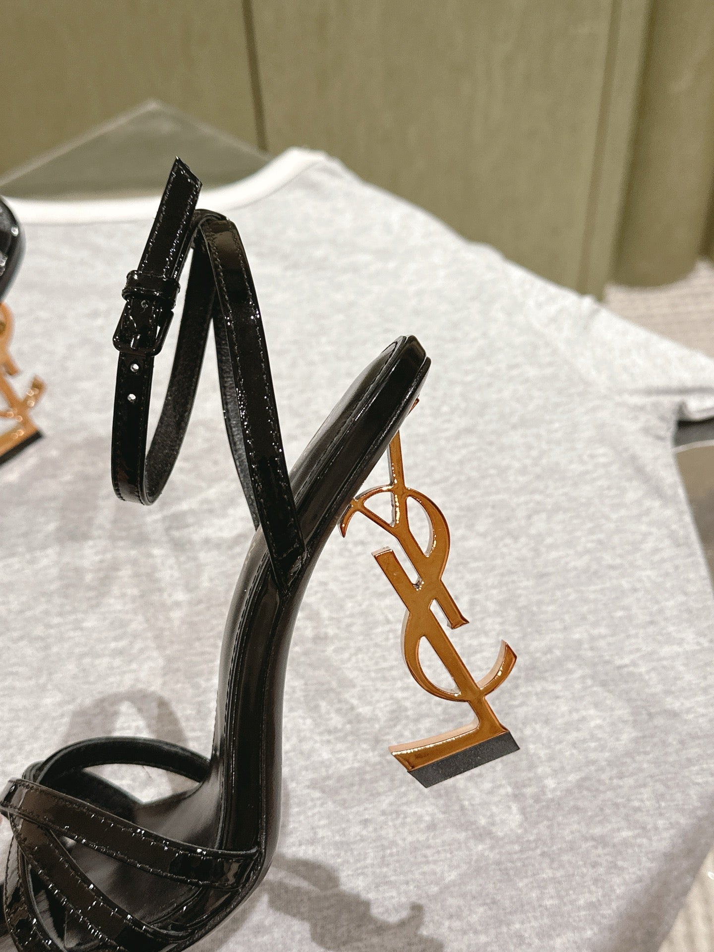 YSL 25S HIGH-HEEL SANDALS 100 MM IN BLACK GLOSSY LAMBSKIN WITH YSL LOGO HEEL DESIGN IN GOLD