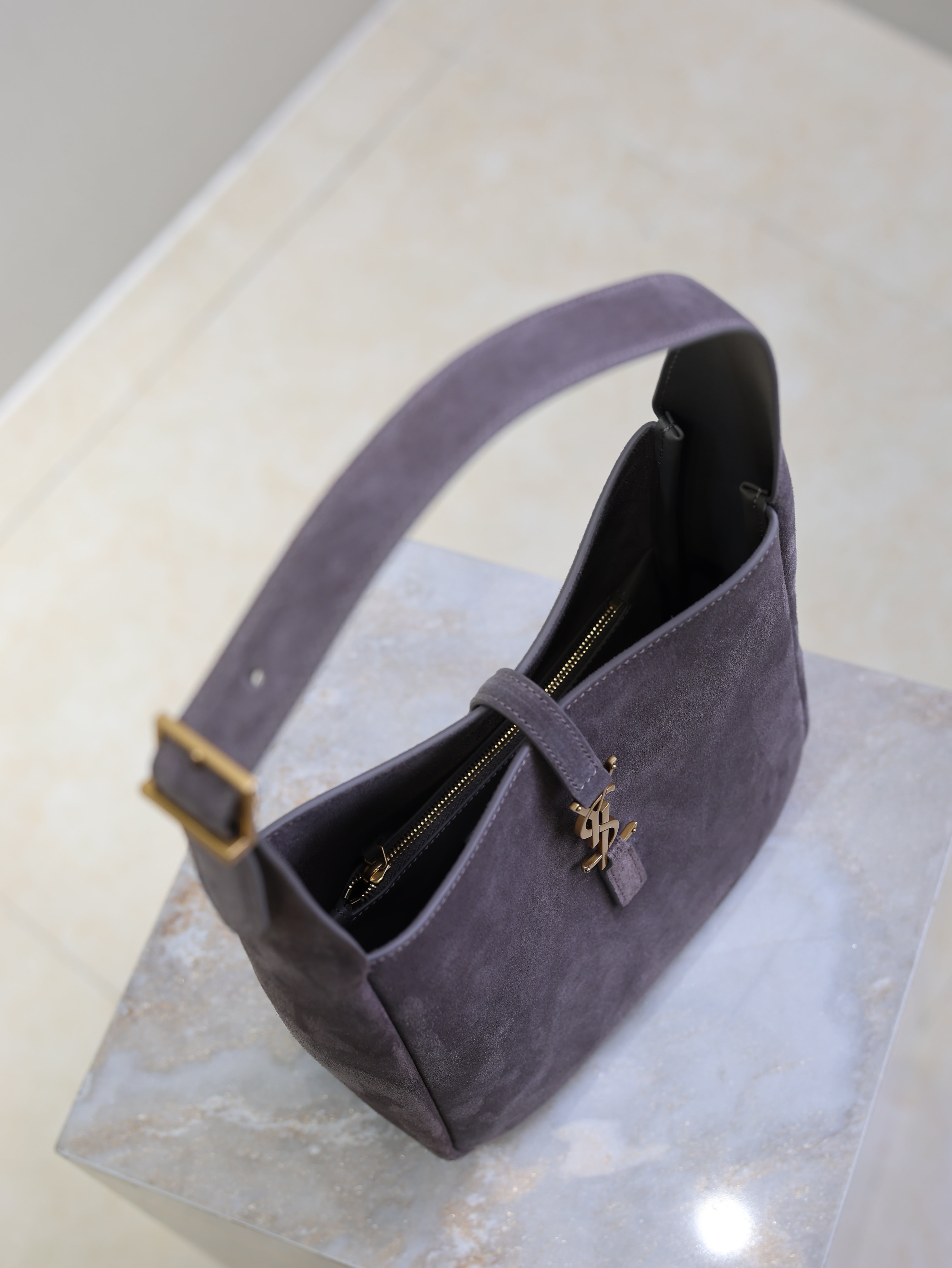 YSL 25S LE 5 À 7 SUPPLE SMALL 23 IN DARK GRAY SUEDE GOLD HARDWRE