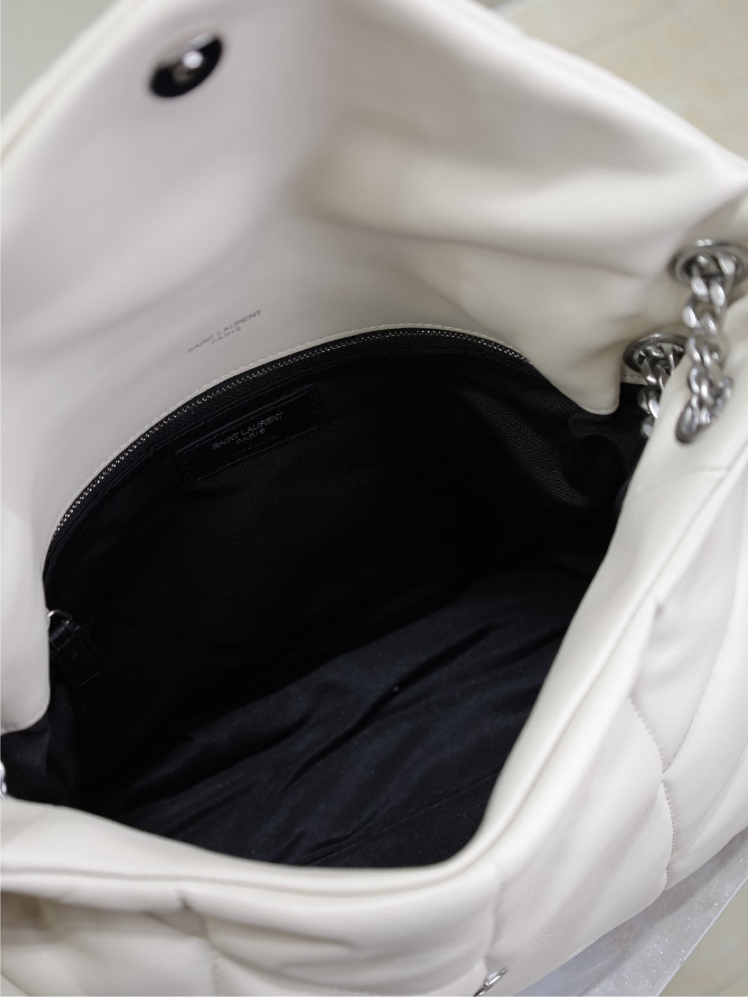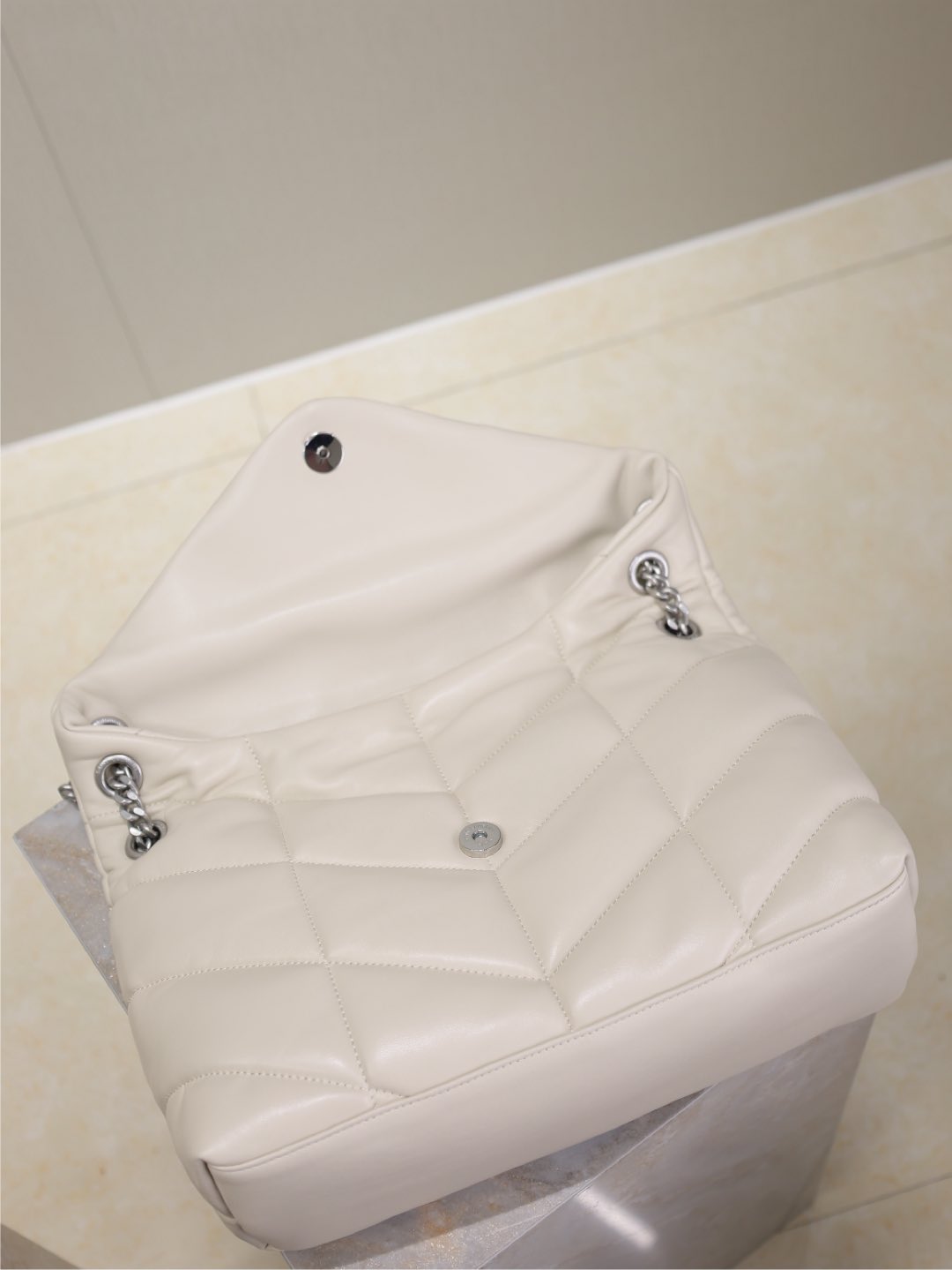 YSL 25S LOULOU PUFFER GM 35 IN SMOKEY TAUPE CALFSKIN SILVER HARDWARE